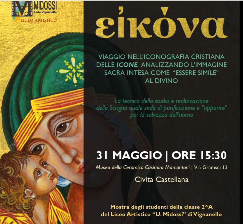 In occasione del progetto, sostenuto dal Dirigente Scolastico Prof. Franco Chericoni, “Tecniche e materiali per la realizzazione delle Icone Sacre nell’arte”, venerdì 31 maggio alle ore 15,30 presso il Museo della Ceramica Casimiro Marcantoni di Civita Castellana in via Gramsci 13, si terrà l’inaugurazione della Mostra “εἰκόνα”, organizzata dagli studenti della classe 2^ A del Liceo Artistico MIDOSSI di Vignanello.