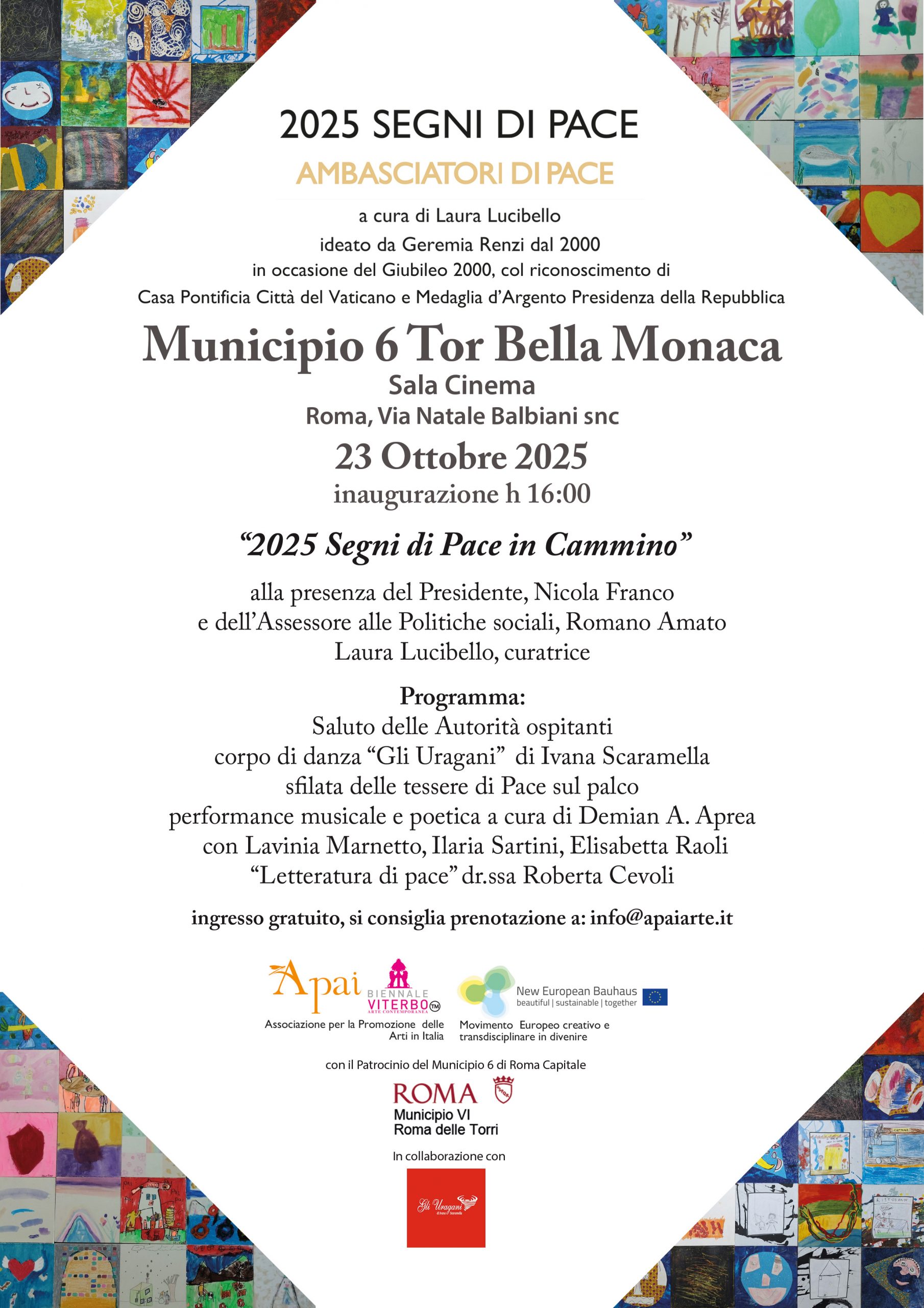 Il progetto “2025 Segni di Pace in Cammino” è un'iniziativa che mira a coinvolgere ed includere i tanti aspetti che caratterizzano una Cultura di Pace globale, come lo sviluppo sociale, la rigenerazione urbana e dei territori, la coesione sociale, la ricostruzione o il rafforzamento dell'identità di comunità, coinvolgendo artisti da tutto il mondo, centri di riabilitazione e recupero, scuole di ogni livello e grado, turisti, pellegrini e tutti coloro che desiderano contribuire a diffondere messaggi di pace durante il Giubileo del 2025. Attraverso eventi artistici, performance e installazioni, si vuole sensibilizzare le comunità sul tema della pace e dell'unità, coinvolgendo persone di ogni provenienza e cultura. Nato da una idea di Geremia Renzi nel 2000 in occasione del Giubileo, col riconoscimento della Casa Pontificia Città del Vaticano e la Medaglia d’Argento della Presidenza della Repubblica, il progetto Segni di Pace, tenutosi in Milano, ha raccolto tantissime piccole opere di artisti internazionali sul tema della pace, tra le quali spiccano quelle di personalità della cultura, dello spettacolo e dell’arte del nostro tempo quali Pietro Consagra, Carla Fracci, Mikhail Gorbachev - Premio Nobel per la Pace 1990 -, Ibrahim Kodra, Vito Melotto, Michelangelo Pistoletto, Franco Scepi.