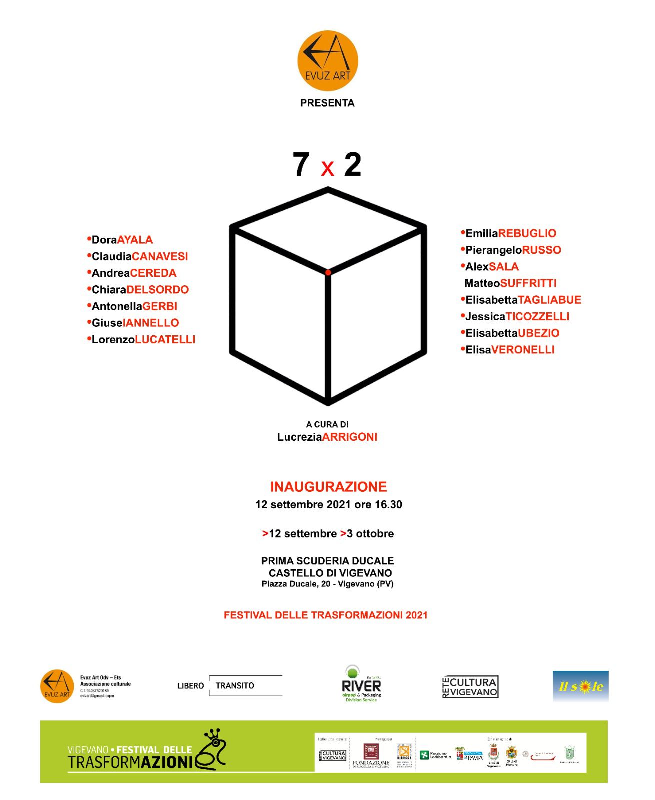 All’interno del programma del Festival delle Trasformazioni, coordinato da Rete Cultura Vigevano - giunto alla sua sesta edizione - avrà luogo la mostra 7x2: una collettiva di 14 artisti dell’Associazione culturale Evuz Art.