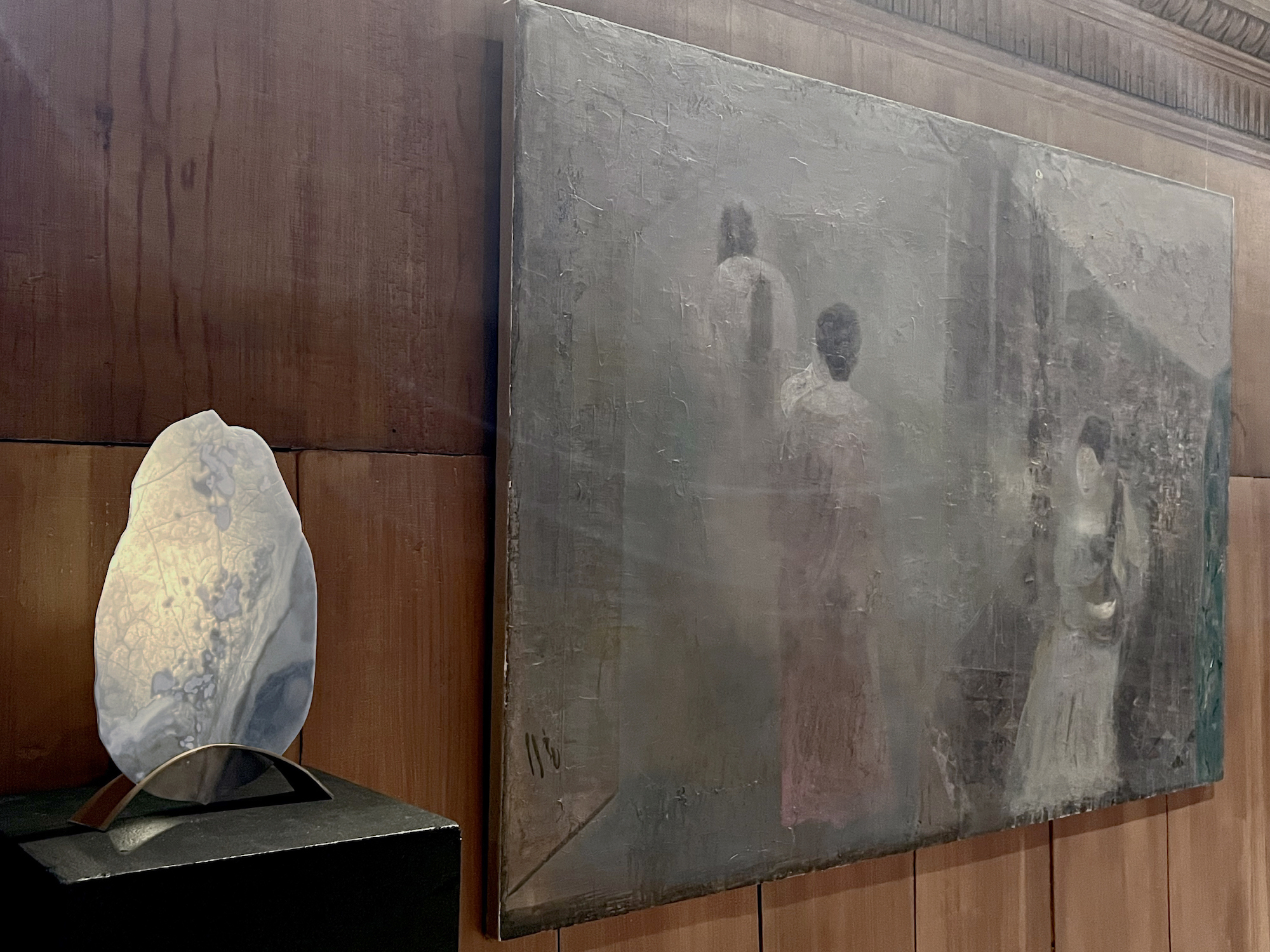 Il percorso si articola in due sezioni: Au Cœur de la Brume, la personale di Leng Hong che con una serie di dipinti evoca l’atmosfera della laguna attraverso paesaggi fluidi e astratti, ispirati alla poesia della Dinastia Tang; e Glauque, la collettiva che raccoglie le opere di Marie-Luce Nadal, Palmalisa Zantedeschi e Adrien Lagrang. Il termine "Glauque", che indica un colore sfuggente tra verde, blu e grigio, evoca le mutevoli profondità marine, l’ambiguità e la bellezza sospesa della nebbia.