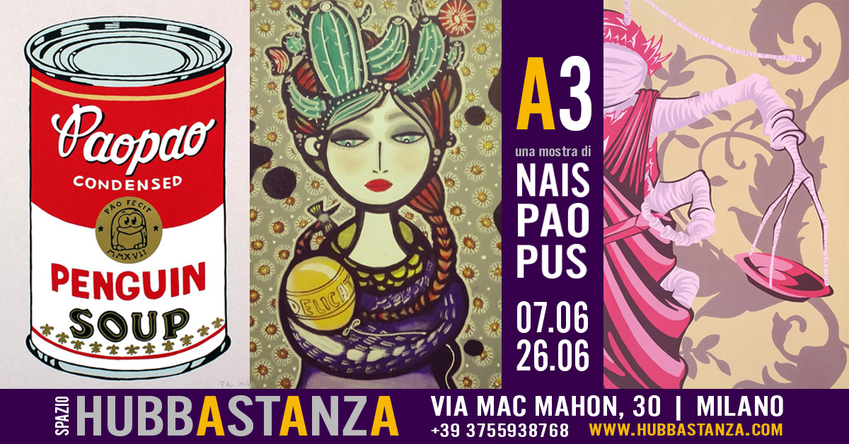 Mostra di Street Art con i lavori di Marzia Nais Formoso, Pus-Francesco Vicari e Pao-Paolo Bordino, autori fra i più rappresentativi sulla scena milanese e non solo. La collettiva sarà ospitata da Hubbastanza, nuovo studio di architettura e spazio creativo destinato a laboratori, corsi e seminari.