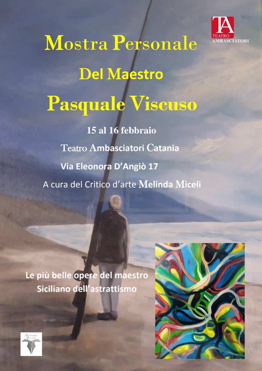 Il Teatro Ambasciatori di Catania dal 15 al 16 febbraio ospiterà la Mostra Personale del Maestro Pasquale Viscuso a cura del Critico d’arte Melinda Miceli presidente del Certamen internazionale sulle cattedrali e direttore artistico onorifico di Ars Magistris, Luz Cultural e Oscar delle arti. In Abstract exibition by Pasquale Viscuso saranno visibili le opere più ricercate del maestro Siciliano dell’astrattismo. La mostra è un grande evento per tutti gli spettatori e visitatori della Rassegna Teatrale di Prosa, per i collezionisti ed ammiratori di uno dei più grandi artisti dell'arte contemporanea.
