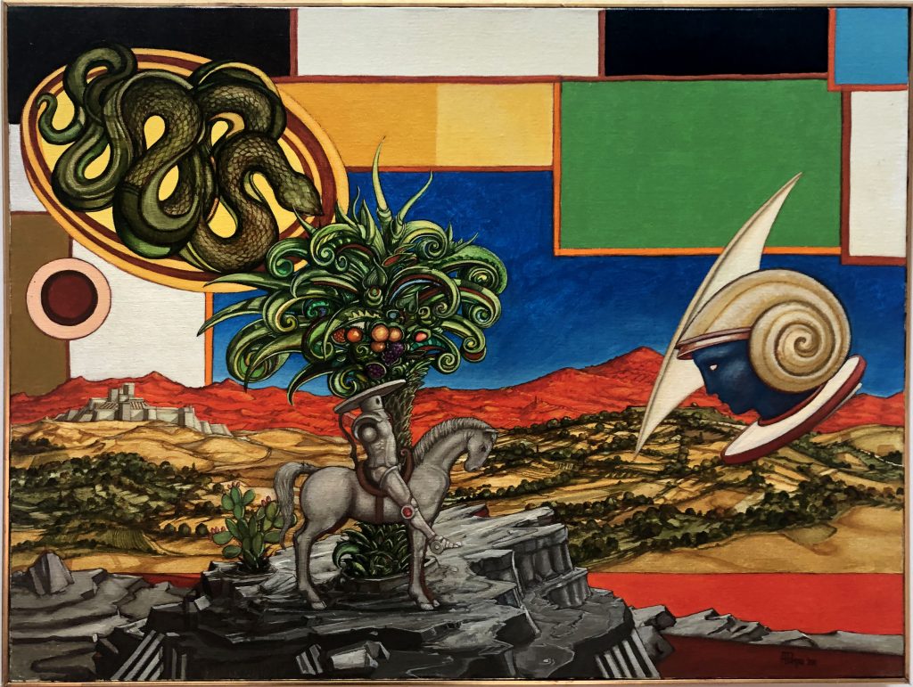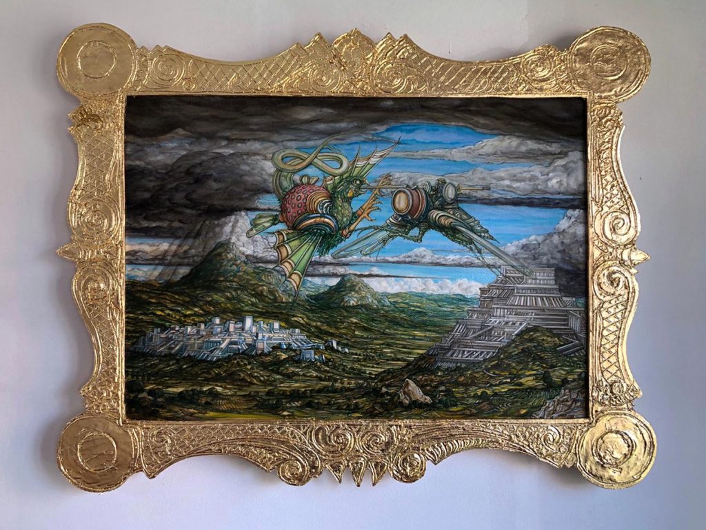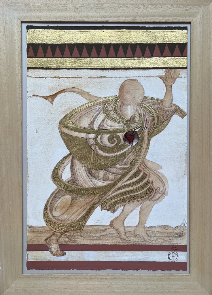 Grand Tour si presenta come un viaggio ideale e visionario ispirato al mito del Grand Tour, reinterpretato da Pompa come esperienza mentale e pittorica. Le sue opere, dominate da un uso simbolico dell’oro, popolano gli spazi della Galleria Vik Milano con apparizioni sospese tra mito, sogno e memoria, in un dialogo poetico tra passato e contemporaneità. L’apertura della mostra coincide con la Giornata internazionale per l’eliminazione della violenza contro le donne. Per questa occasione, Adriano Pompa ha voluto offrire un omaggio speciale, un pensiero dedicato al tema della libertà femminile attraverso una figura simbolica della nostra tradizione letteraria: Angelica dell’Orlando Furioso.