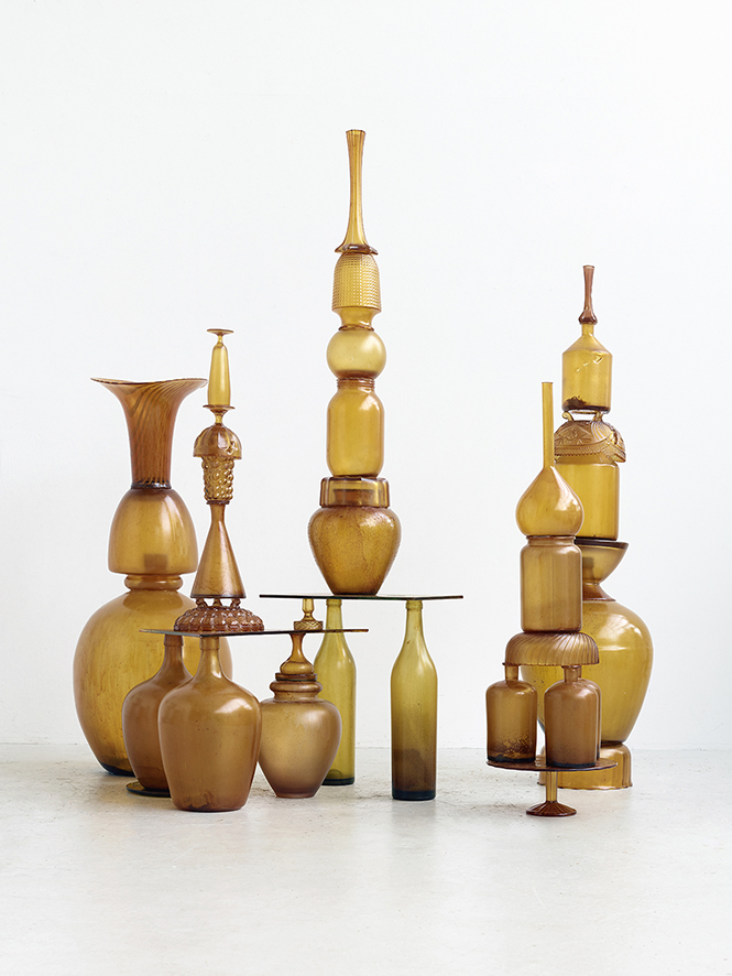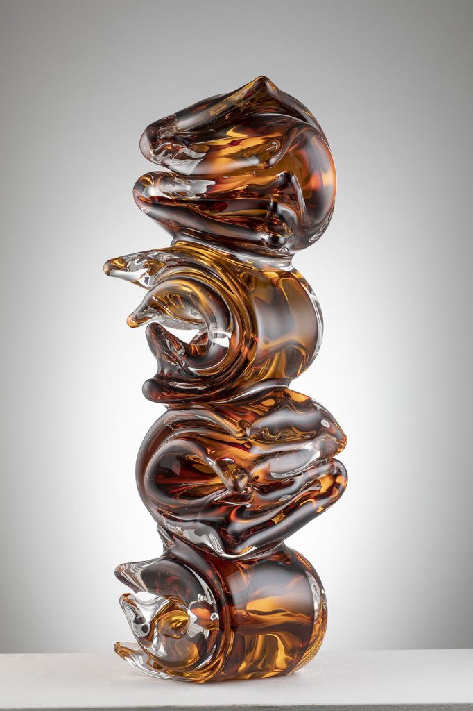 Non più vincolato alle tradizionali forme ritrovate di bottiglie e altri oggetti classici, in questi lavori più recenti ha potuto esplorare le possibilità di manipolazione della materia allo stato fuso. Questa duttilità lo ha visto “coreografare” in fornace composizioni elaborate e originali, che sono emerse organicamente, e dalla sua mente sono scivolate tra le mani dei maestri per essere plasmate in una nuova presenza fisica, quella che resiste alla stasi della scultura e arriva invece a catturare il movimento e l’energia di un singolo momento.