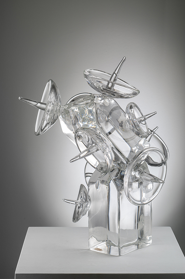Non è un caso, quindi, se il vetro diventa uno dei suoi principali elementi di ispirazione: il vetro è il crogiuolo in cui si fondono, rotti e ricomposti, i meccanismi organici e il potenziale libero della forma che si trans-forma, che va al di là di se stessa per diventare altro. E non è un caso, dunque, che questa mostra si chiami proprio Silicon Dioxide, perché è proprio quel diossido di silicio da cui nasce il vetro che contiene in sé non solo una necessaria struttura chimico-organica, ma anche la scintilla creativa della materia pronta ad esprimersi come nuova forma, nuova opera d’arte.