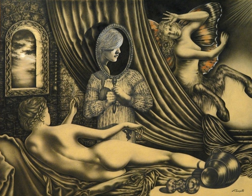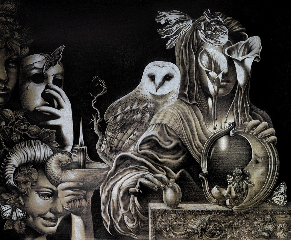 Pure grafite e matite grasse su carta delineano quindi composizioni allegoriche a carattere onirico e surreale.