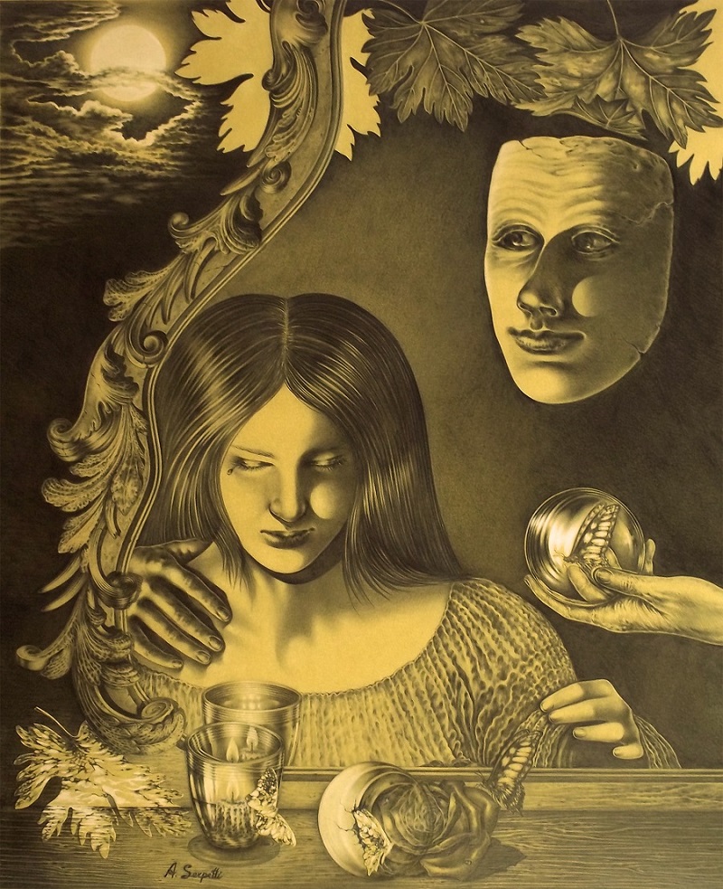 Alessio Serpetti (Roma, 1975) manifesta precocemente la passione per il disegno e a soli nove anni inizia a studiare tecniche grafiche e pittoriche con Carlo Marcantonio dapprima presso l’Accademia Prenestina del Cimento, poi alla Scuola d’Arte “Casa Romana”. Dopo la Maturità artistica consegue il Diploma Accademico di Scenografia presso l’Accademia delle Belle Arti di Roma e inaugura il suggestivo ciclo delle “Vedute di scena”, che presenta in Personali a Tarquinia (Museo Etruscopolis, 2010). Successivamente orienta la sua ricerca verso un simbolismo onirico e surreale avviando la raffinata collezione “L’Arte del Sogno”, che presenta nelle Personali di Vicenza (Palazzo Valmarana Braga, 2015), Bologna (Galleria Wikiarte, 2015), Spoleto (Palazzo Leonetti Luparini, 2016). Si dedica poi all’incisione (acquaforte) per delineare poetiche visioni tra classico ed allegorico che include nella raccolta dei “Notturni arcani”, con cui vince nel 2017 il Premio della 5°a Biennale dell’Incisione Contemporanea “Città di Bassano del Grappa”. Nel 2019 tiene Personali a Bassano del Grappa (Museo Civico) e a Sesto Fiorentino (La Soffitta - Spazio delle Arti, ove le sue opere “dialogano” con incisioni dei Maestri del Simbolismo storico europeo di fine Ottocento). Partecipa alla Biennale di Venezia - Architettura (2021, evento collaterale), alle Biennali di Chianciano (2011), Roma (2012), Londra (2013), Barcellona (2015), alla Triennale di Roma (2011 e 2017).