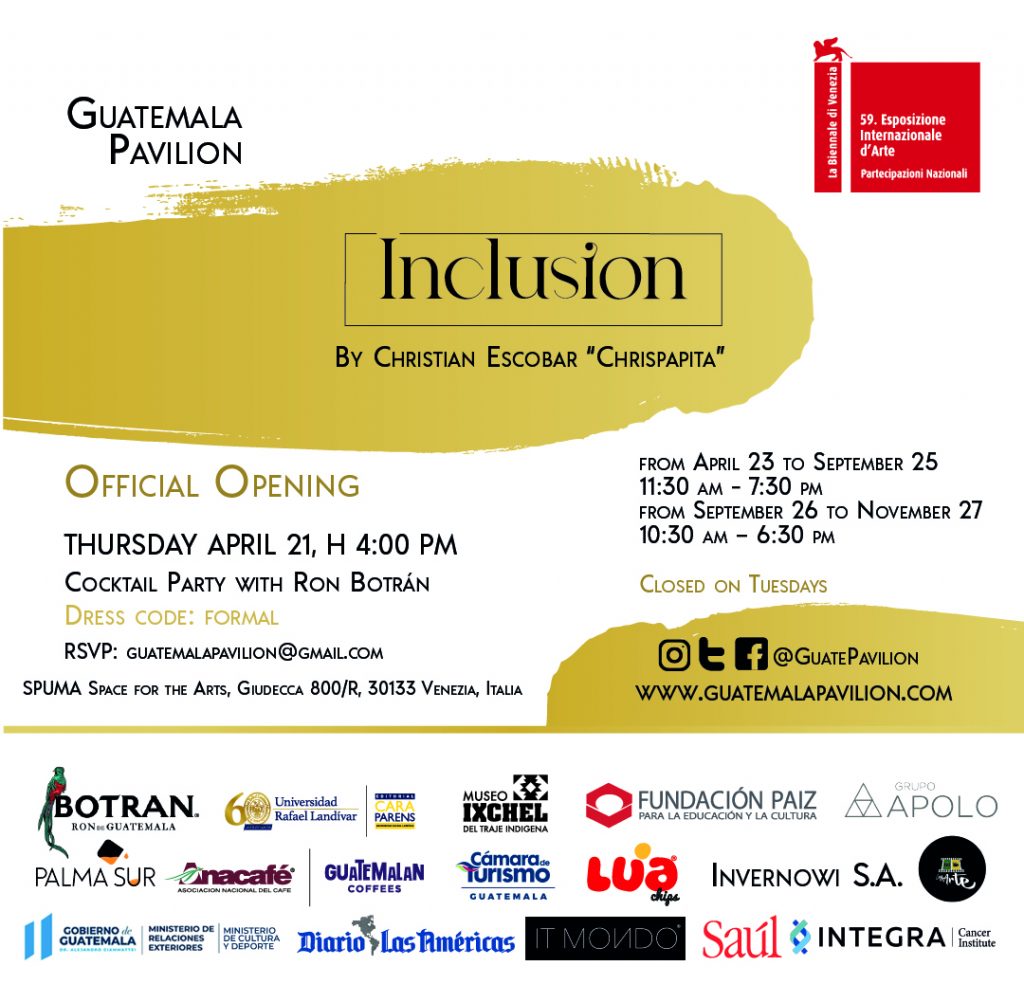 In linea con il tema della 59a Esposizione Internazionale d’Arte della Biennale d’Arte di Venezia, che porta il titolo “Il latte dei sogni”, il Padiglione Nazionale del Guatemala giovedì 21 aprile, ore 16:00, presenterà in anteprima l’imponente dipinto intitolato “Inclusione”, del giovane artista Christian Escobar “Chrispapita” (Instagram: @chrispapita), anche curatore della mostra.