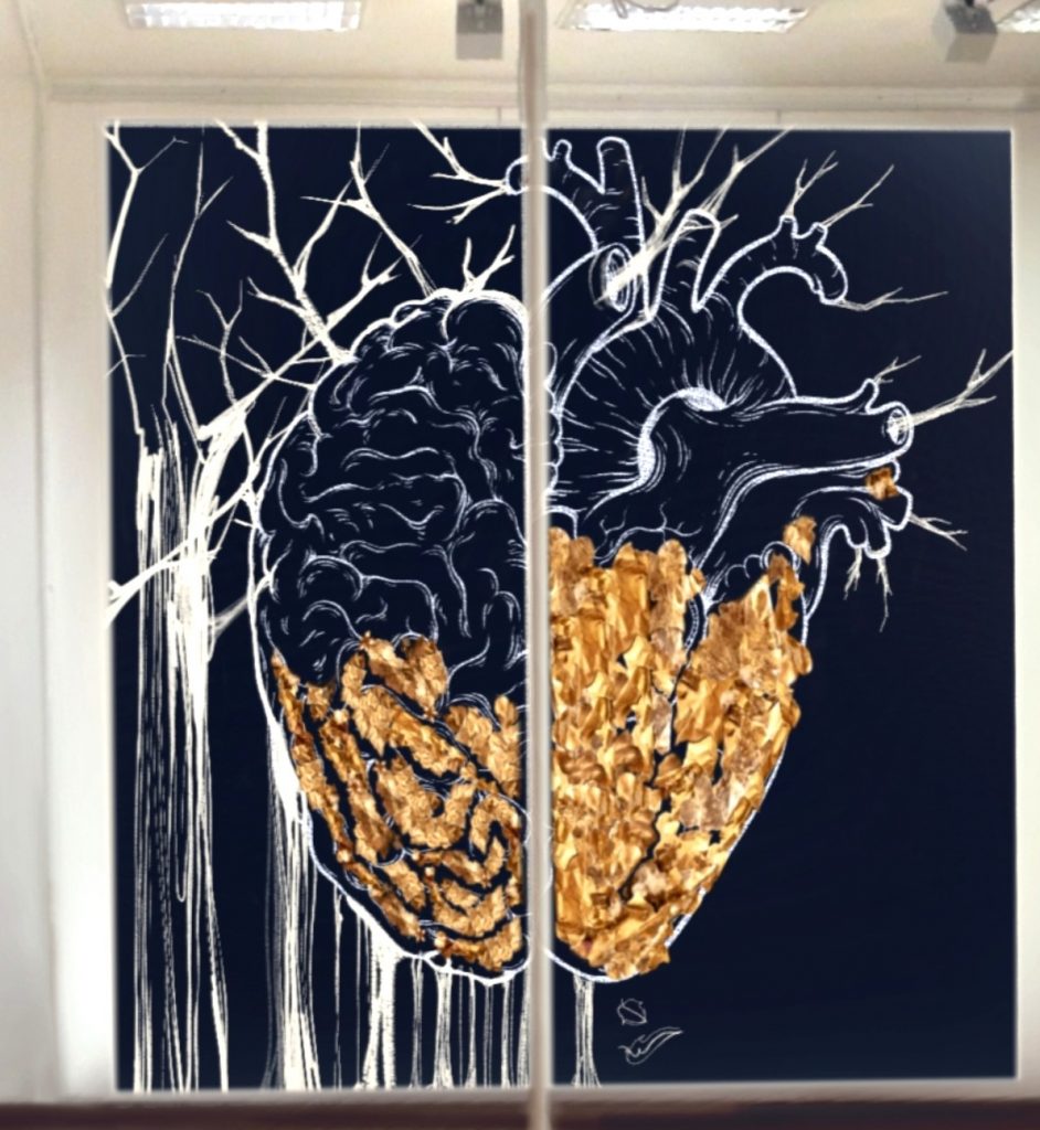 Duemila foglie d’edera tagliate amorevolmente nella carta e dorate a mano, mantra creativo e filo conduttore di questo progetto: duemila pensieri da donare ritualmente all’installazione, persona per persona, entrando nello spazio sacro dell’arte in punta dei piedi.