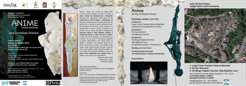 Anime che vivono un tempo fatto di ricostruzione urbana, di sutura di ferite e paure ... narrare le tracce i segni e la scia di energia. La connessione tra il luogo e le opere è fortemente tangibile, la poesia interpretativa dell'artista Jörg C. Grünert non lascia spazio al dubbio e sentiamo con evidente forza che le anime torneranno a sedersi sui gradini, nelle stanze, negli antichi luoghi di lavoro, sotto gli archi, negli slarghi, nelle prospettive delle vie. ... (Maria Rosa Dei Svaldi, direttora artistica di Castellarte)