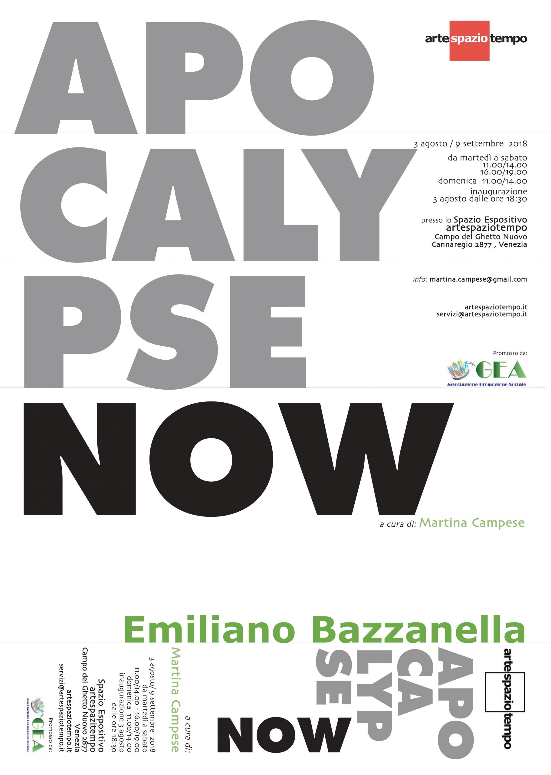 Arte Spazio Tempo e l’Associazione di promozione sociale e culturale GEA hanno il piacere di presentare Apocalypse Now, un progetto di Emiliano Bazzanella, artista e filosofo contemporaneo che, con una serie di citazioni cinematografiche (lo stesso titolo si rifà al film di Francis Ford Coppola 1979), politiche, sociali e scientifiche, ci accompagna in un possibile futuro popolato da “reperti” pseudo-archeologici e paleontologici della nostra attualità.