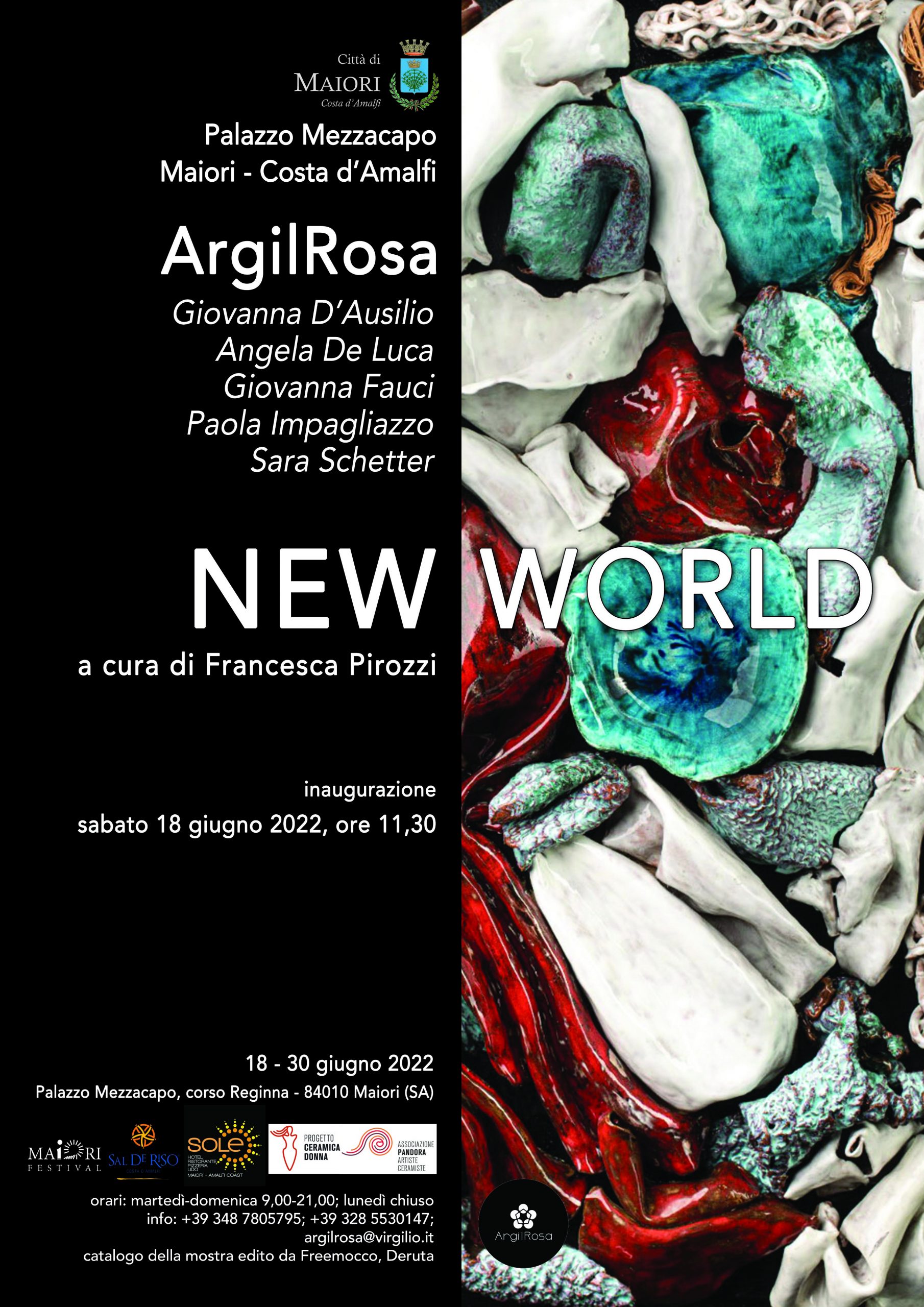 La personale del collettivo ArgilRosa, dal titolo “New World”, a cura di Francesca Pirozzi, in programma dal 18 al 30 giugno 2022, al Palazzo Mezzacapo di Maiori, in Costa d’Amalfi, propone l’ultimo inedito progetto delle ceramiste Giovanna D’Ausilio, Angela De Luca, Giovanna Fauci, Paola Impagliazzo e Sara Schetter. La mostra, che inaugura sabato 18 giugno 2022 alle ore 11.30, è patrocinata dal Comune di Maiori ed è accompagnata da un catalogo edito da Freemocco, Deruta.