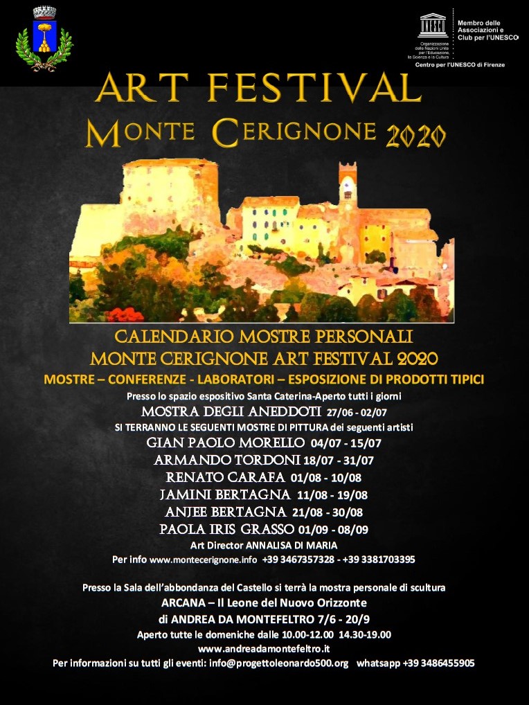L'antico borgo di Monte Cerignone ospiterà la rassegna artistica Art Festival 2020, dove esporranno con delle personali artisti provenienti da tutta Italia. Il Progetto firmato dall'Art Director Annalisa Di Maria presenta il supporto del Centro per l'UNESCO di Firenze.
