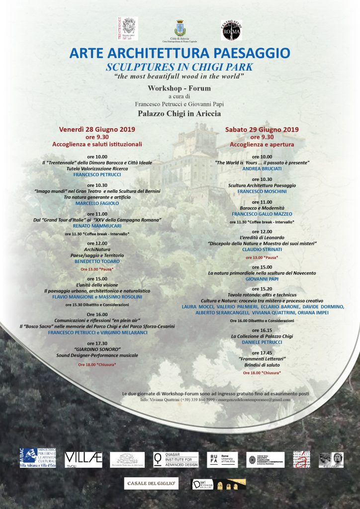 La manifestazione dal titolo: ARTE ARCHITETTURA PAESAGGIO-SCULPTURES IN CHIGI PARK è un progetto interdisciplinare alla sua prima edizione che prevede una serie di iniziative e una mostra finale. E' ambientato nello straordinario complesso monumentale di Palazzo Chigi in Ariccia e nell'attiguo Parco il “più bel bosco del mondo” (Stendhal) ed è pensato all’insegna del “Dialogo tra le Arti”. E’ rivolto a studiosi, storici dell’arte, appassionati e professionisti, artisti e architetti delle Accademie straniere e delle istituzioni culturali italiane, desiderosi di confrontarsi ed entrare in dialogo con uno dei più insigni e celebri contesti ambientali della storia dell’arte sotto la regia di Gian Lorenzo Bernini, in una ideale continuità con le esperienze e lo spirito dei viaggiatori del “Grand Tour d’Italie”.