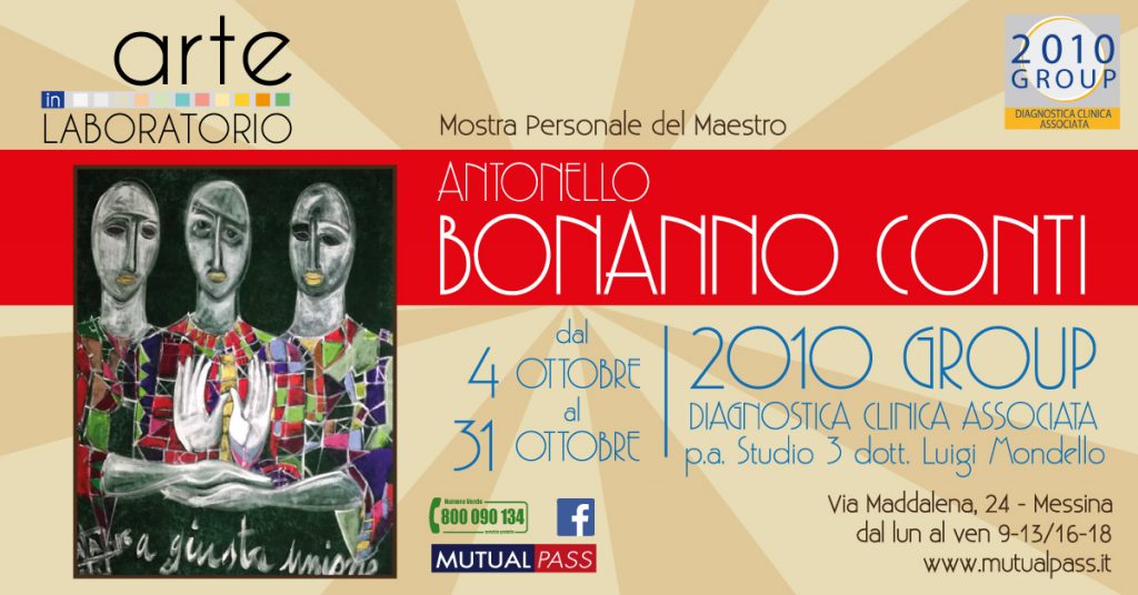 Dopo le esposizioni delle opere dei maestri Aurelio Valentini e Mantilla, verrà inaugurata giovedì 4 ottobre alle ore 18, nei locali di via Maddalena 24 a Messina (Studio 3 - dott. Luigi Mondello), la mostra dell’artista Antonello Bonanno Conti che sarà possibile visitare per quattro settimane fino al 31 ottobre. Il team di MutualPass, che ha ideato ed organizzato l’iniziativa, intende ribaltare la consolidata immagine degli spazi legati unicamente alla malattia e al disagio fisico, trasformando il laboratorio d’analisi 2010 Group in una galleria d’arte a tutti gli effetti. L’ambizioso progetto punta, inoltre, a stringere ancora di più il benefico connubio tra arte e salute, seguendo la linea disegnata da “Quadro Clinico-Stare Bene con Arte”, l’evento culturale realizzato a gennaio nella Chiesa di Santa Maria Alemanna, che ha posto al centro la collettiva di 27 artisti messinesi o d’adozione dal titolo appunto “Quadro Clinico”.