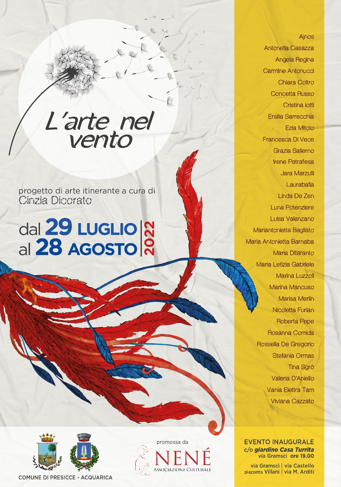 Mostra collettiva diffusa - i balconi nel centro storico del borgo di Presicce si arricchiscono di lenzuola dipinte come opere d'arte. Per la realizzazione sono state coinvolte 33 artiste provenienti da tutta Italia, in un'installazione per diffondere bellezza e lanciare un messaggio di sorellanza.