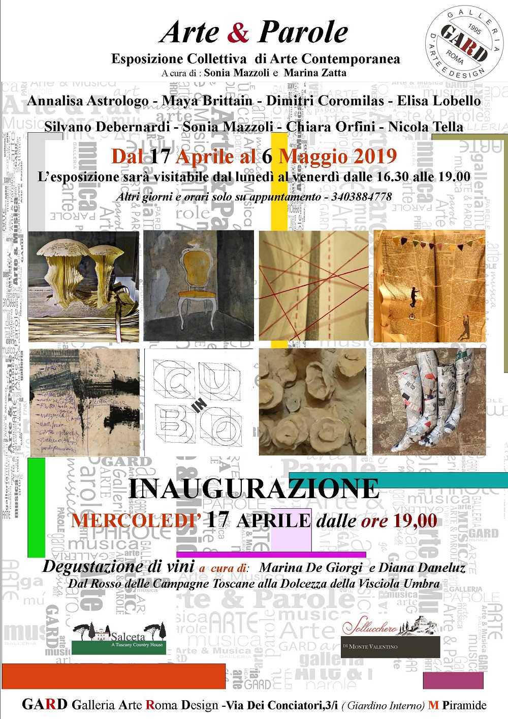 DOVE: GARD Galleria Arte Roma Design - V. Dei Conciatori 3/i (giardino interno) M Piramide INAUGURAZIONE: Mercoledì 17 Aprile - dalle ore 19.00 DURATA : Dal 17 Aprile al 6 Maggio 2019 ORARI: Dalle 16.30 alle 19.00 - dal lunedì - al venerdì - ( altri giorni e orari su appuntamento) INGRESSO: libero