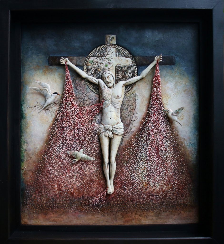 La realizzazione delle due opere è stata accompagnata da alcuni momenti di incontro e di confronto, coordinati da due noti esperti in arte sacra: p. Andrea Dall’Asta, direttore della Galleria San Fedele di Milano e della Raccolta Lercaro di Bologna, e l’arch. Claudia Manenti, direttore del Centro Studi “Dies Domini” della Fondazione Lercaro e coordinatore del Comitato scientifico di “Devotio”. L’opera “Dal legno oscuro” di Luca Pianella è una riflessione sul “Christus Patiens”. Realizzata su carta, muta a seconda dell’orientamento della luce e della posizione dell’osservatore, grazie ad una differenziata modalità di tracciare la grafite. Un’alternanza di campiture luminose e oscure, che creano un incisivo effetto simbolico che va oltre la semplice rappresentazione della figura. Saba Masoumian ha realizzato invece l’altorilievo “Dono”, partendo da una lastra di polistirolo che poi ha ricoperto di colori e di mosaici, creando una scena altamente poetica. Evocando antiche rappresentazioni di sapore paleocristiano, senza nascondere alcune suggestioni orientali, la sua attenzione si è concentrata sulle piaghe di Cristo, da cui esce sangue abbondante sotto forma di piccolissimi semi, di cui si nutrono alcuni piccoli uccelli in volo: il sangue di Cristo si fa così seme di vita per i fedeli.