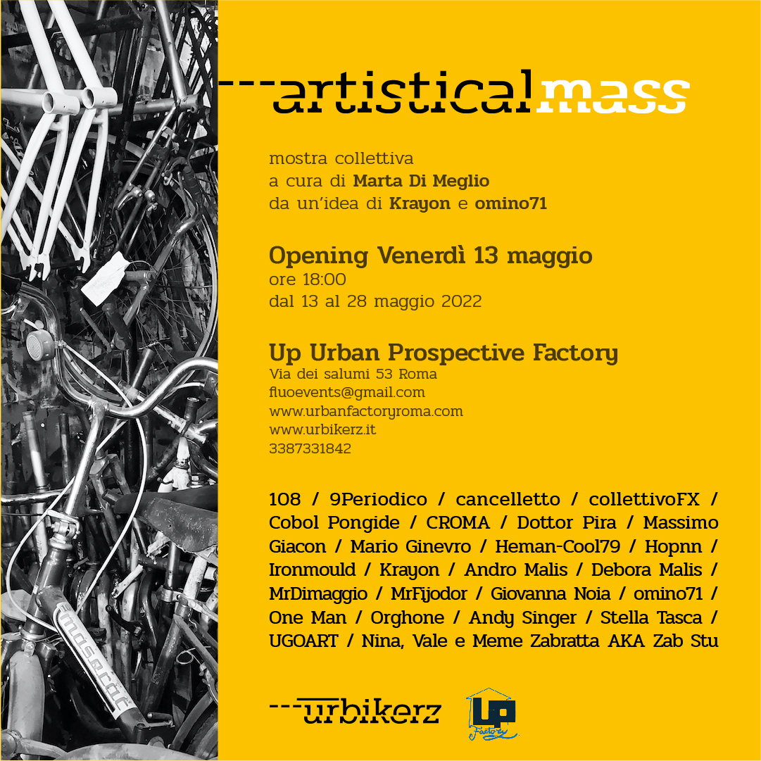 Venerdì 13 maggio Up Urban Prospective Factory è lieta di presentare artisticalmass, progetto collettivo di artisti-ciclisti nato da un’idea di Krayon e omino71, con un’esposizione a cura di Marta Di Meglio. L’opening si svolgerà presso lo spazio espositivo di Via dei Salumi 53, Trastevere, Roma.