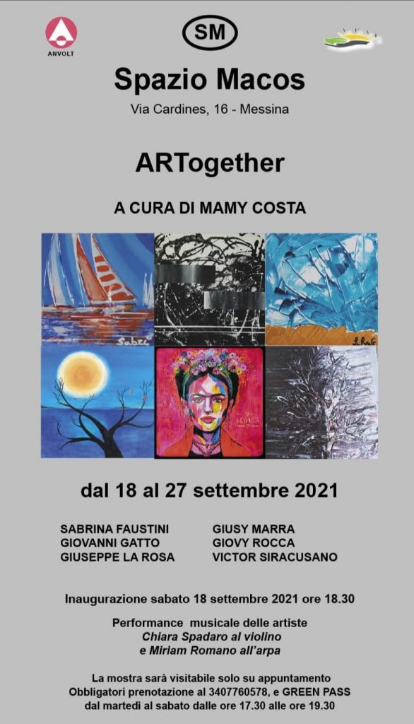 Sabato 18 settembre 2021, alle ore 18.30, presso Lo Spazio Macos, in Via Cardines, 16 a Messina, sarà aperta al pubblico la mostra collettiva “ARTogether” curata da Mamy Costa, alla presenza del Presidente dell’Ass. Apat, dr. Carmelo Briante. L’inaugurazione sarà allietata dalla performance musicale delle giovani artiste Chiara Spadaro e Miriam Romano all’arpa, entrambe studentesse di Conservatorio e saranno Premiate da Spazio Macos, con il “Premio al Giovane Talento”. La mostra sarà visitabile adottando le misure precauzionali per la tutela della salute pubblica, saranno obbligatori prenotazione al 3407760578 e GREEN PASS, con ingresso scaglionato.