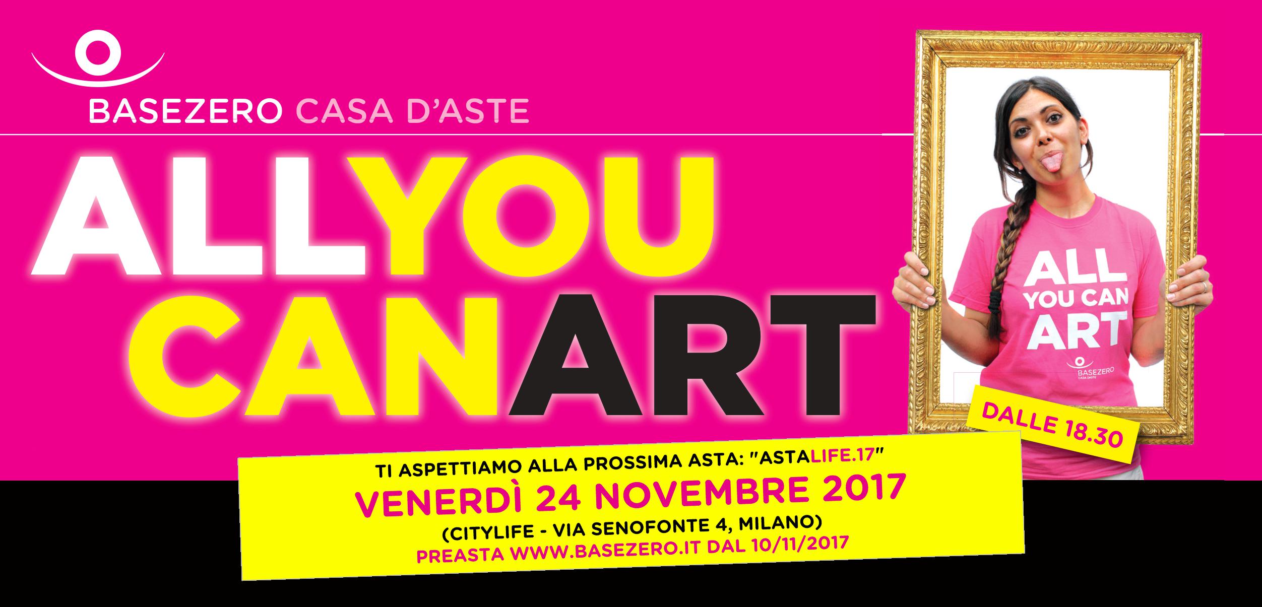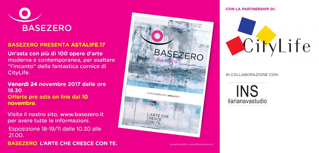 ASTALIFE.17 sarà on line dal 10 novembre, consultabile al sito www.BASEZERO.it, per la pre- asta. Le opere saranno esposte sabato 18 e domenica 19 novembre dalle 10.30 alle 20.30, mentre l’asta vera e propria si terrà venerdì 24 novembre a partire dalle 18.30.
