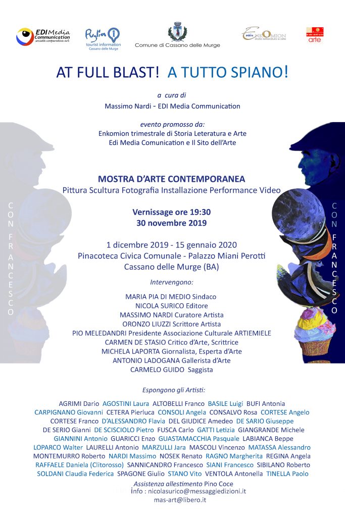 A cinque anni dalla prima edizione, questa tappa presso la Pinacoteca Civica di Cassano delle Murge, omaggio alla figura di Francesco Sannicandro; un ulteriore arricchimento per confermare l’approccio autentico con cui At Full Blast si è sviluppata, dimostrandosi ancora una volta capace di avanzare “A tutto spiano”; una realtà che, insieme ai suoi artisti, continua a rinnovarsi nel tempo e nei luoghi senza mai ripetersi. Michela Laporta