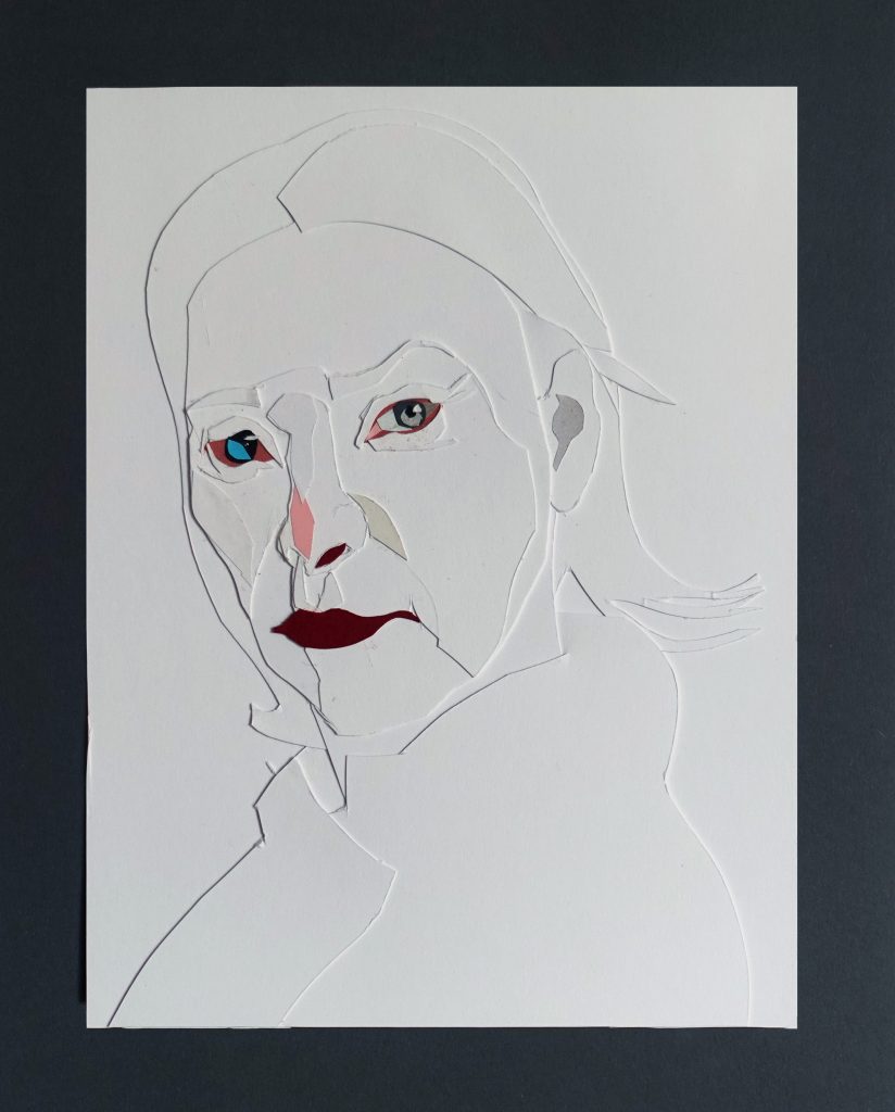 Per l’artista il collage è concepito come un “ritaglio libero”, che egli esegue senza un disegno guida, ma direttamente sulla carta, con l’aiuto di un bisturi. Il processo è meditato, non istintivo, e richiede una notevole capacità di astrazione partendo da uno schema mentale.