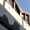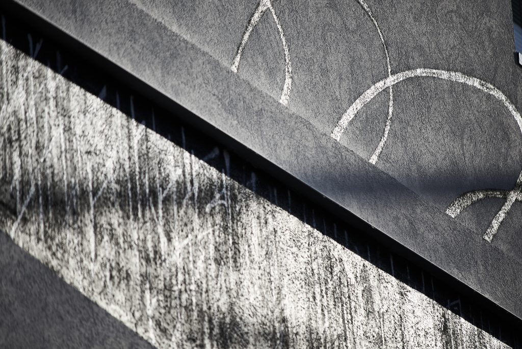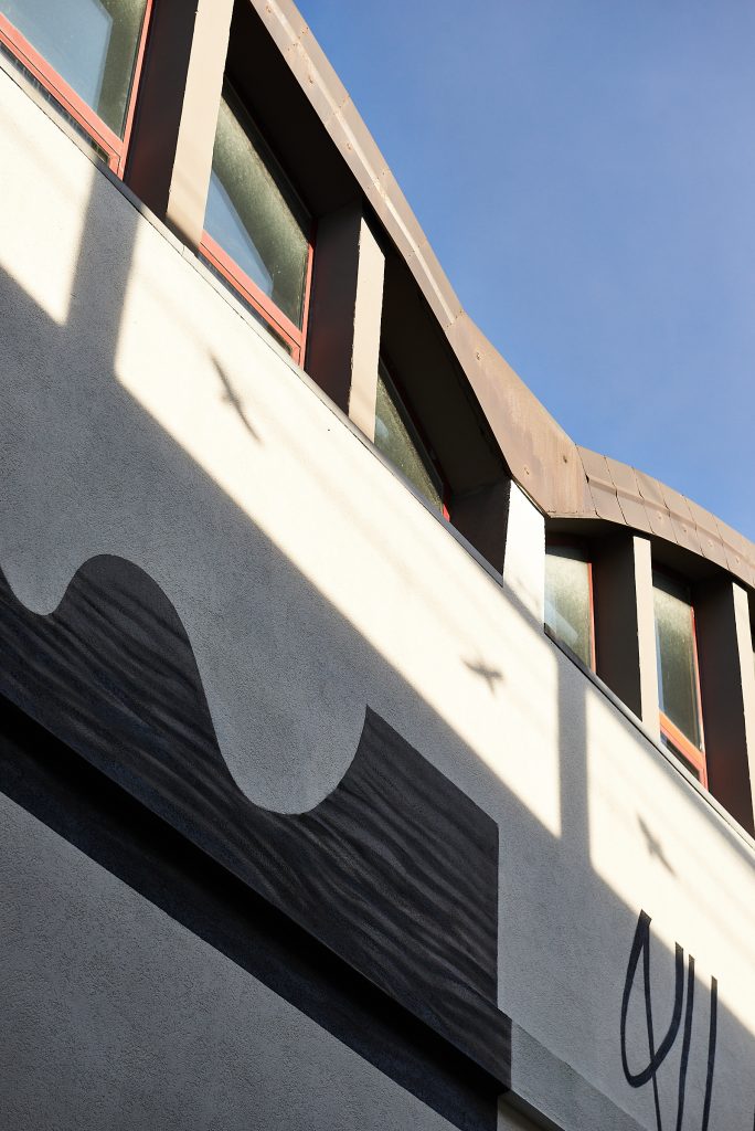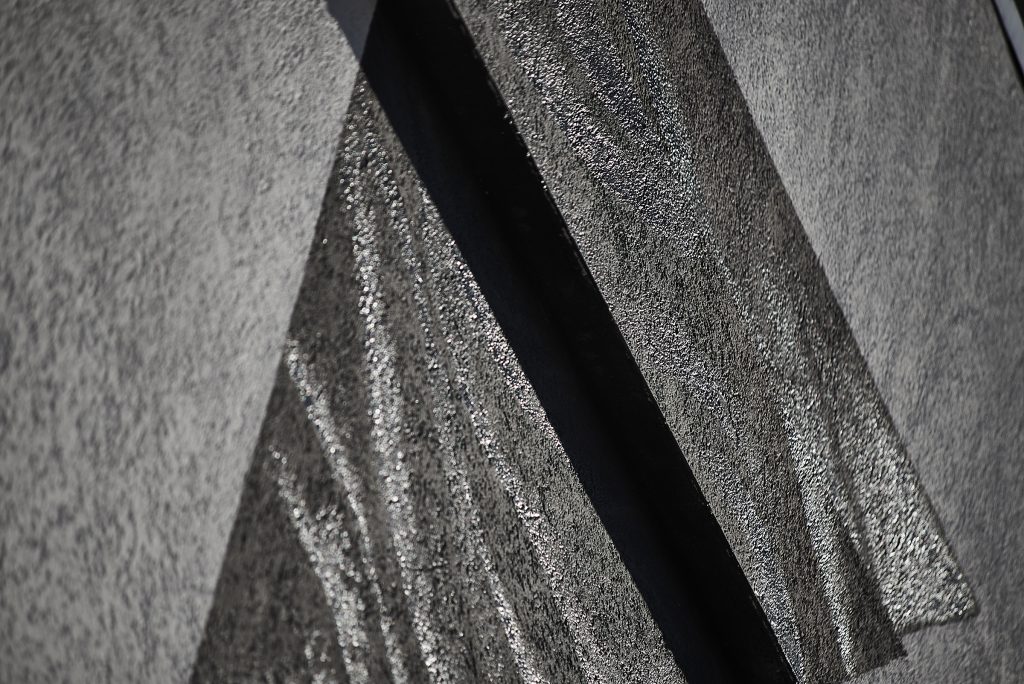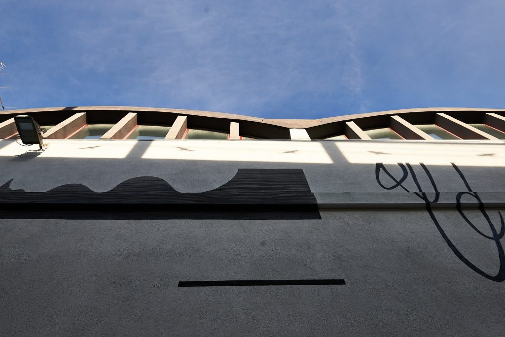 Giudice fa sue queste textures, combinandole con il repertorio degli elementi che caratterizzano la sua poetica e le ripropone sulle supefici dell’edificio: essenze biologiche organiche ed inorganiche, trame, tracce, rese attraverso un segno grafico minimale.