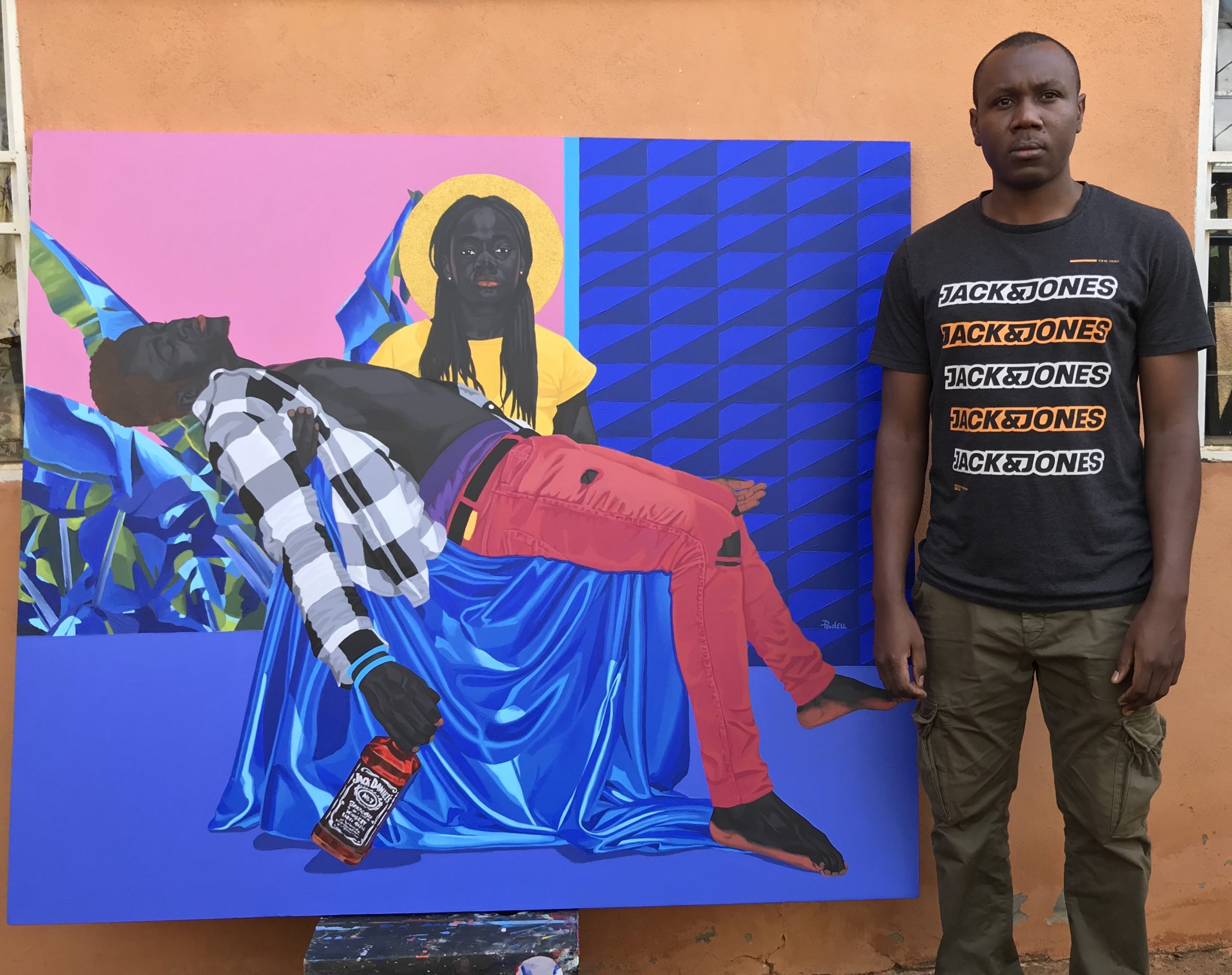 Il tema dell’infanzia è presente anche in Boris Gobina, il suo è un lavoro dove è palpabile l’influenza esercitata da altri artisti, attira immediatamente l’attenzione lo sfondo, che ricorda le opere dell’ivoriano Aboudia che a sua volta si è ispirato al grande artista afroamericano Basquiat. La componente graffitara nello sviluppo della formazione degli artisti africani di questa generazione è molto evidente. Abbattuti i confini territoriali l’arte sta assottigliando le sue distanze e la reinterpretazione di immagini catturate dal web mescolate e amalgamate con il vissuto quotidiano rappresenta la perfetta sintesi della loro poetica.