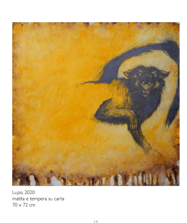 Per Marco Rossi, il più giovane del quartetto, l’impiego della carta è più che consueto: buona parte della sua opera è realizzata su supporto cartaceo. “La tela è un supporto con cui fatico a entrare in relazione”, afferma lui stesso, “mi sembra fredda... La uso perlopiù per intelare la carta! La carta accoglie meglio il mio segno. Mi ci sento più a mio agio”. Anche nella ricerca di Armando Fettolini il foglio ha sempre avuto un ruolo importantissimo, come spazio di esplorazione, sperimentazione e conquista di nuove dimensioni espressive. Negli ultimi anni, in particolare, la carta compete con la tavola, da sempre supporto d’elezione per l’artista, ospitando con esiti affascinanti e talvolta inattesi, la sua inconfondibile materia e il suo modo di usare il colore. “Per me la carta è la pelle dell’arte”, spiega, invece, Giangi Pezzotti, “è messaggera di racconti indescrivibili”. Indubbiamente le sue narrazioni, con le loro atmosfere profondamente evocative, trovano nella carta un luogo ideale, che ne esalta la tavolozza vibrante dei blu e dei gialli e sottolinea il fascino ancestrale delle figure. Anche Sergio Battarola ritiene che la carta sia uno spazio intimo dove dare libero sfogo al proprio segno potentemente espressivo, il luogo idea e dove far vivere i suoi animali, facendo emergere tutta la forza della loro iconica presenza. Lupi, corvi, cinghiali, bufali, serpenti – creature temibili e pericolose prendono vita in questi disegni monocromi, che dialogano splendidamente con il colore e la tattilità del supporto.