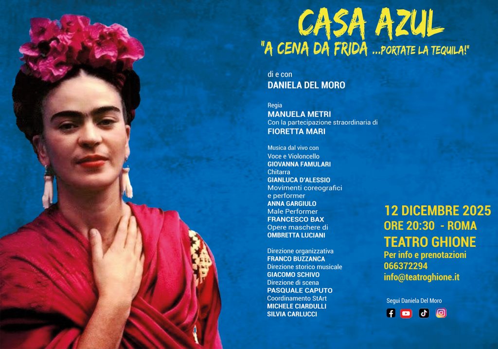 Venerdì 12 dicembre alle ore 20:30, il Teatro Ghione di Roma ospita Casa Azul – A cena da Frida... portate la tequila!, uno spettacolo originale di e con Daniela Del Moro, per la regia di Manuela Metri, con la partecipazione straordinaria di Fioretta Mari, musica dal vivo, coreografie e un allestimento visivo che unisce teatro, arte e narrazione. Una produzione STArt, che invita il pubblico a sedersi idealmente alla tavola di Frida Kahlo, per una notte di festa, memorie e rivelazioni.