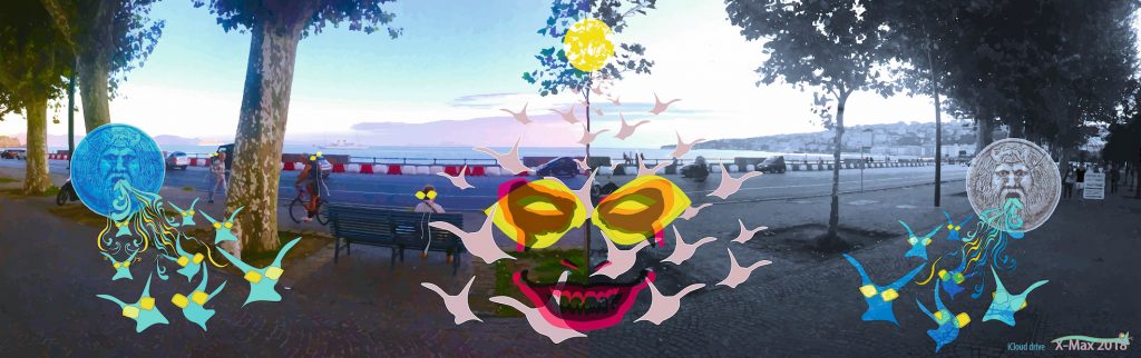 Allucinazioni, percezioni di realtà parallele, mondi paralleli, reali e immaginari popolati da figure “aliene” hanno danno vita ad una fantasiosa interpretazione della realtà quasi “disneyana” ricca di figure fantasmagoriche. Personaggi atipici, tipologie di terrestri, esseri mai visti prima, vengono riprodotti da X-Max fotograficamente e pittoricamente con disegni vettoriali. Paesaggi invisibili dove corpo e mente si incontrano nel loro transito temporale, visioni distorte dai colori alterati della natura, immagini di cellule organiche, ricordi visivi, fenomeni legati alla percezione e processi cerebrali permetteranno al visitatore di inoltrarsi in una realtà “altra” immaginata. Dal sole ai pianeti, chi e cosa ci circonda e plasma invisibile le nostre scelte, le energie invisibili, silenti, vengono trasferite nelle opere da Cavuoto per mostrare a tutti il mondo che ha attraversato la sua esistenza fino a poco tempo fa e per riuscire ad andare avanti nella creazione di opere d’arte del tutto nuove. Tra reale e onirico, concreto e fantastico, oggettivo e soggettivo come in un eterno fotogramma pittorico e fotografico di suggestioni visive, le opere entrano anche fisicamente nello spazio per rendere impossibile la distinzione tra le due dimensioni: una metafora del vivere attraverso una continua riflessione dicotomica sul suo senso. Mente e corpo, artificiale e naturale si incontrano per esplorare la relazione esistente tra arte e natura, attraverso un paziente lavoro di smembramento delle forme organiche e non ricavate dalla realtà e dalla fantasia fino a raggiungere i termini della loro rappresentazione. Attraverso la sua ricerca intende far riflettere sulle nostre radici, memorie, tracce, sentimenti ed emozioni, con tutte le implicazioni filosofiche che i temi trattati comportano. L’arte, per l’artista napoletano, è una condizione esistenziale, una ricerca della bellezza che ci sovrasta, la possibilità di stabilire un contatto diretto con le opere attraverso le quali tenta di restituirci la sensazione di una magia, un incantesimo come una sorta di viaggio introspettivo nelle vicende esistenziali della vita rese con immagini e naturalezza per analizzare ciò che c’è nel profondo del suo animo e per edificare come un “muratore dell’universo”, in maniera astratta, cieli, colline, case e oggetti, sensazioni che lo colpiscono e che gli restano nella memoria. Attraverso le opere in mostra, realizzate con diversi medium-fotografia, disegno, computer -viene analizzata la “frattura” che esiste tra realtà e immaginazione per riuscire ad indagare la vita. Una via di accesso alle strutture profonde del reale, una ricerca continua che approdando ad un’immagine del mondo è nel contempo il riverbero della propria coscienza, la sua esplicitazione sensibile resa con un’intima urgenza espressiva.