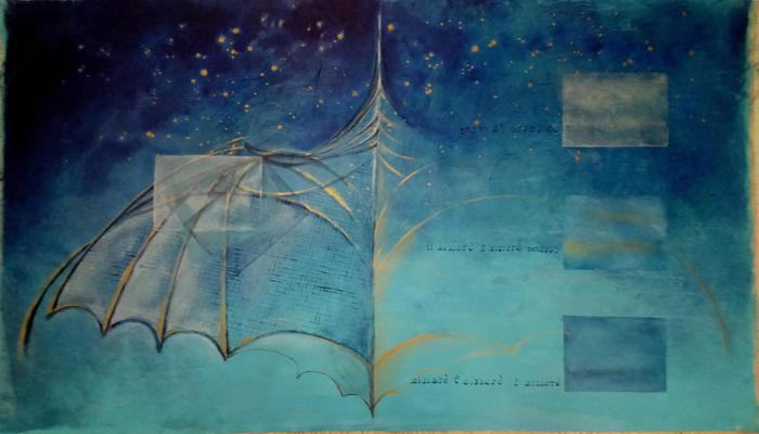 Veneziano ha scelto di lasciar parlare Leonardo, ponendo in primo piano la sua straordinaria opera tecnica e scientifica, arricchendola di quell’afflato artistico che accosta il pensiero alla poesia. Parola scritta e disegno tecnico, esaltati da colori concettuali e onirici insieme, si sublimano nella levità poetica dell’arte: ruote, cannoni, congegni meccanici, formule matematiche, danzano fra stelle e pianeti avvolti nell’immensità siderale che è metafora sia della vastità potenziale del sapere umano, sia di quell’ignoto che ancora sfugge alla conoscenza. Una pittura intrisa di Realismo Magico che ammanta di meraviglia le intuizioni di Leonardo, e sfiora il Simbolismo nel tratteggiare aeree visioni di volti e marchingegni; metafora della levità celeste dell’ingegno umano, quando messo al servizio del progresso civile. La concretezza delle opere leonardiane assurge allo status di bellezza dell’intelligenza, così come nella concezione di Plotino (che fu poi anche quella rinascimentale); l’utile aristotelico e platonico si arricchisce dell'intuizione dell’artista che crea l'unità fra le parti: il pensiero matematico, la sua traduzione in segni e disegni, risplende nella simmetria, si fa icona di civiltà e trionfo dell’intelletto.