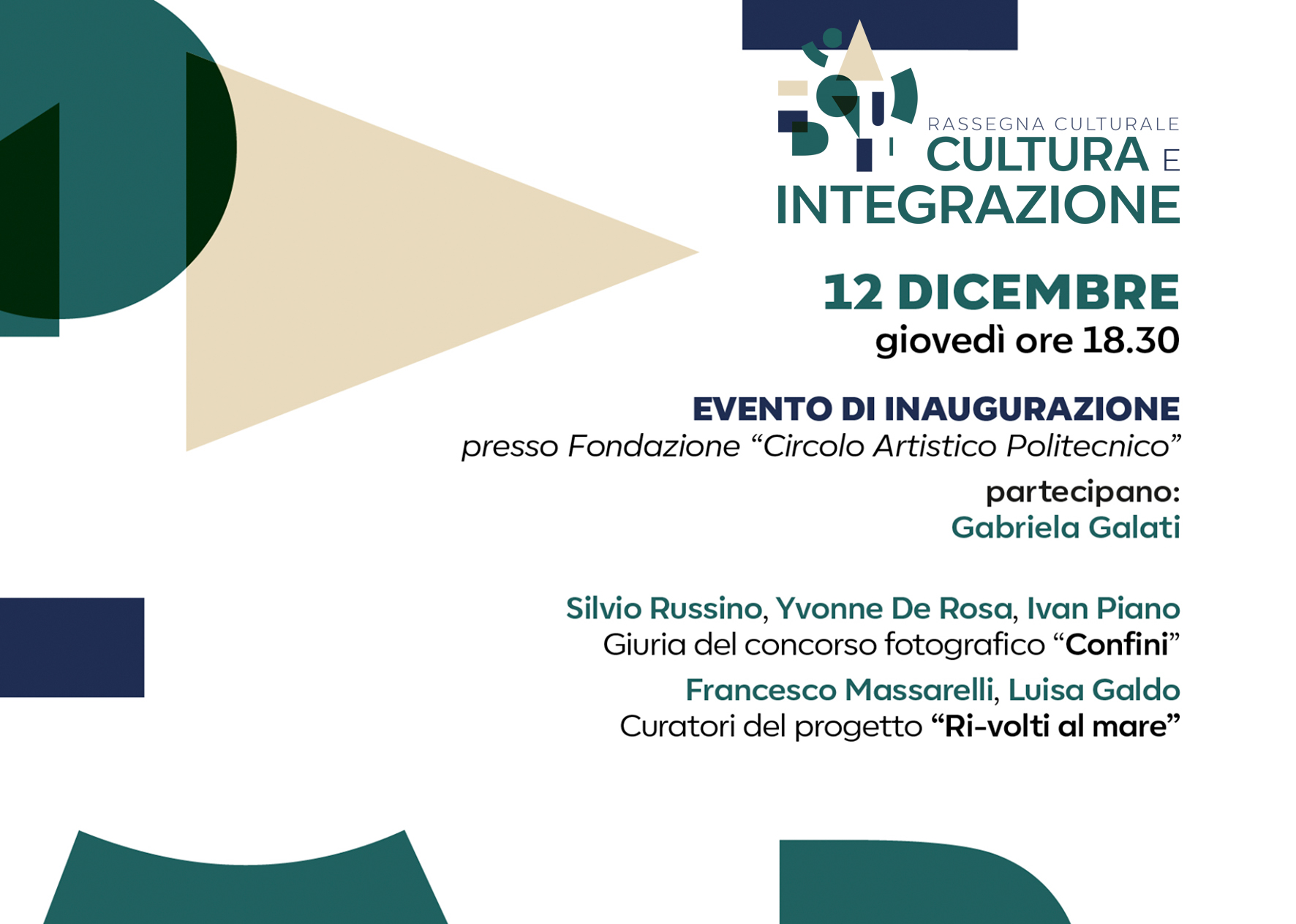 Giovedì 12 dicembre 2019, alle ore 18.30, nelle sale della Fondazione Circolo Artistico Politecnico si terrà l’evento inaugurale della rassegna, con la premiazione e l'esposizione dei progetti fotografici dei vincitori del bando per giovani fotografi denominato “Confini”; un tema attraverso il quale l'associazione Parti Solutions intende sottoporre all'attenzione dei partecipanti un argomento di grande attualità legato alla politica internazionale degli ultimi anni.