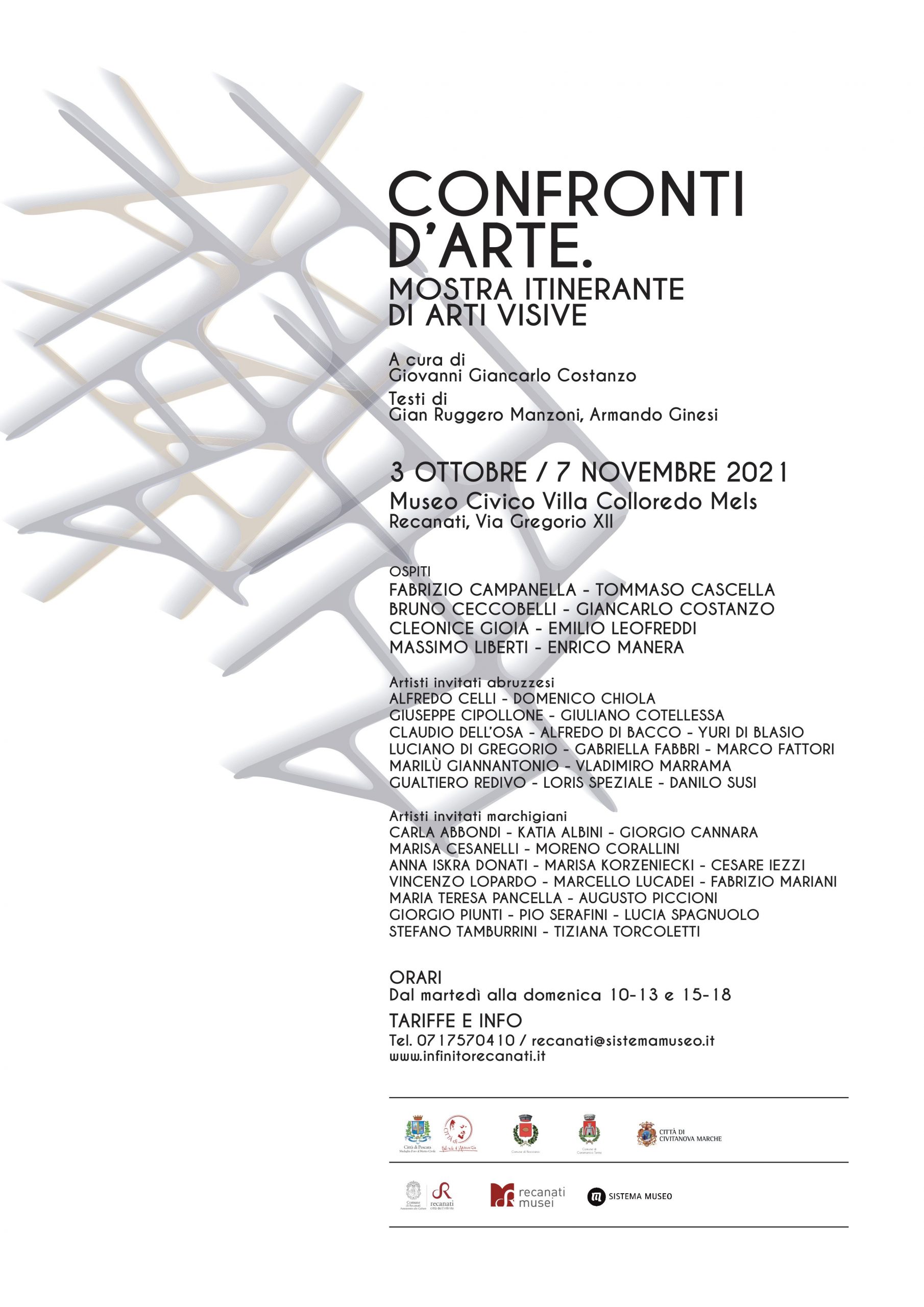 Sarà visitabile dal 3 ottobre al 7 novembre a Recanati, nei prestigiosi spazi del Museo Civico di Villa Colloredo Mels, la mostra itinerante di arti visive "Confronti d'Arte", iniziativa che mette a confronto le opere di 18 artisti abruzzesi e di 18 artisti marchigiani attivi nelle arti figurative, e che ospita anche le opere di 8 artisti di fama come Fabrizio Campanella, Tommaso Cascella, Bruno Ceccobelli, Giancarlo Costanzo, Cleonice Gioia, Emilio Leofreddi, Massimo Liberti ed Enrico Manera.