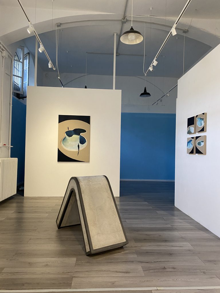Per questa mostra, Fabio Cipolla ha indagato proprio sulle piscine, dove il vuoto si trasforma in spazio da riempire con gesto, materia, relazione. Negli anni ’70, in California, a causa di un lungo periodo di siccità, molte piscine vennero svuotate. Alcuni surfisti iniziarono a mettere le ruote alle loro tavole, passando dall'acqua al cemento. Questo gesto di occupazione creativa dello spazio è al centro del suo lavoro: uno sguardo attento e non passivo, che si oppone al flusso frenetico della città e sceglie la sosta, il gesto, l’interazione. Le sculture in mostra si inseriscono in questa riflessione, attivando lo spazio pubblico e restituendo centralità al corpo, alla sua impronta, alla sua capacità di lasciare traccia. Attraverso forma e materia, cerca di creare oggetti che non siano solo da osservare, ma da abitare: superfici che si fanno piani d’incontro, gradini, tavoli, sedute, oppure supporti per l’intervento pittorico e collettivo.