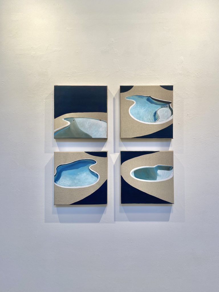 Le opere di Sofia Fresia in questa nuova miniserie nascono con l’intento di riflettere su alcune dinamiche che caratterizzano i rapporti interpersonali ai giorni nostri. Utilizzando una figurazione semplice, ai limiti del geometrico, dove raffigurano figure umane isolate, immerse in spazi sospesi, spesso di fronte a piscine svuotate, metafore di una mancanza, di un vuoto relazionale. Questi dipinti presentano scenari immaginari in cui titolo, contesto e personaggi contribuiscono a delineare alcune caratteristiche o situazioni che hanno a che fare con le difficoltà delle relazioni umane all’interno della società delle immagini e del consumo. Per un nuotatore la piscina vuota è inutile, mentre al contrario è perfetta per lo skater; in una società così variegata, tantissime cose e situazioni possono avere questa doppia valenza, e sta a noi riconoscerle.