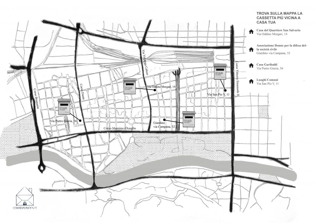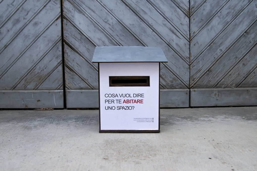 Grazie al sostegno e alla collaborazione della Casa del Quartiere, di Casa Garibaldi, della residenza Luoghi Comuni San Salvario e dell'associazione Donne per la difesa della società civile, saranno installate dalla metà di maggio in via Oddino Morgari 14, via Pietro Giuria 56, via San Pio V 11 e nel giardino di via Campana 32, delle cassette delle lettere che portano affissa sul fronte la domanda "Cosa vuol dire per te abitare uno spazio?”. Tali cassette rimarranno a San Salvario fino alla fine di giugno, pronte a raccogliere racconti, parole, disegni, fotografie e tutto ciò che chi è interessato a rispondere riterrà utile per stabilire un contatto esprimendo la sua idea di abitare uno spazio.