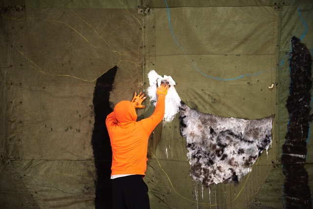 7.24 X 0.26 GALLERY presenta, il 9 Aprile alle ore 19:00, in Via San Pietro all’Orto 26 a Milano, la gigantesca tela di 40 mq realizzata con tende vintage dell’esercito americano. Queste sono state cucite tra loro secondo un ordine pensato per accogliere l’opera in cui si depositano schegge di vita di persone comuni che vi lasciano una impronta grazie ai capelli, gli stessi tagliati da Pier Giuseppe Moroni nel suo lavoro di hairstylist.