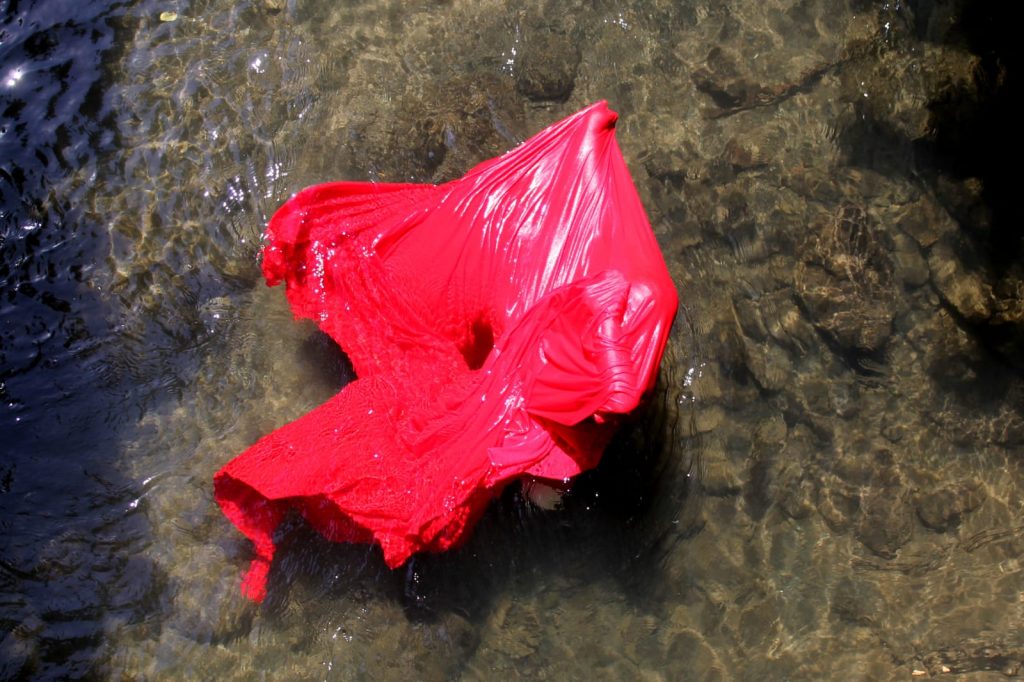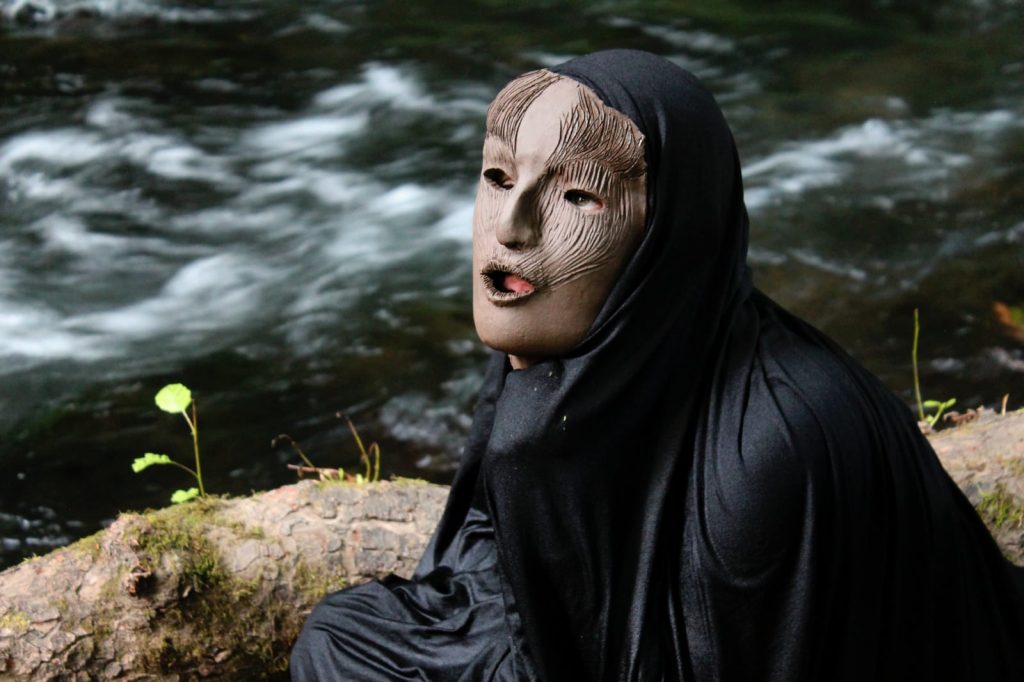 In Maschere per Rituali moderni di Marta Pisani, il fiume, da sempre luogo sacro e teatro naturale di riti, vede un’interazione con il rituale moderno.