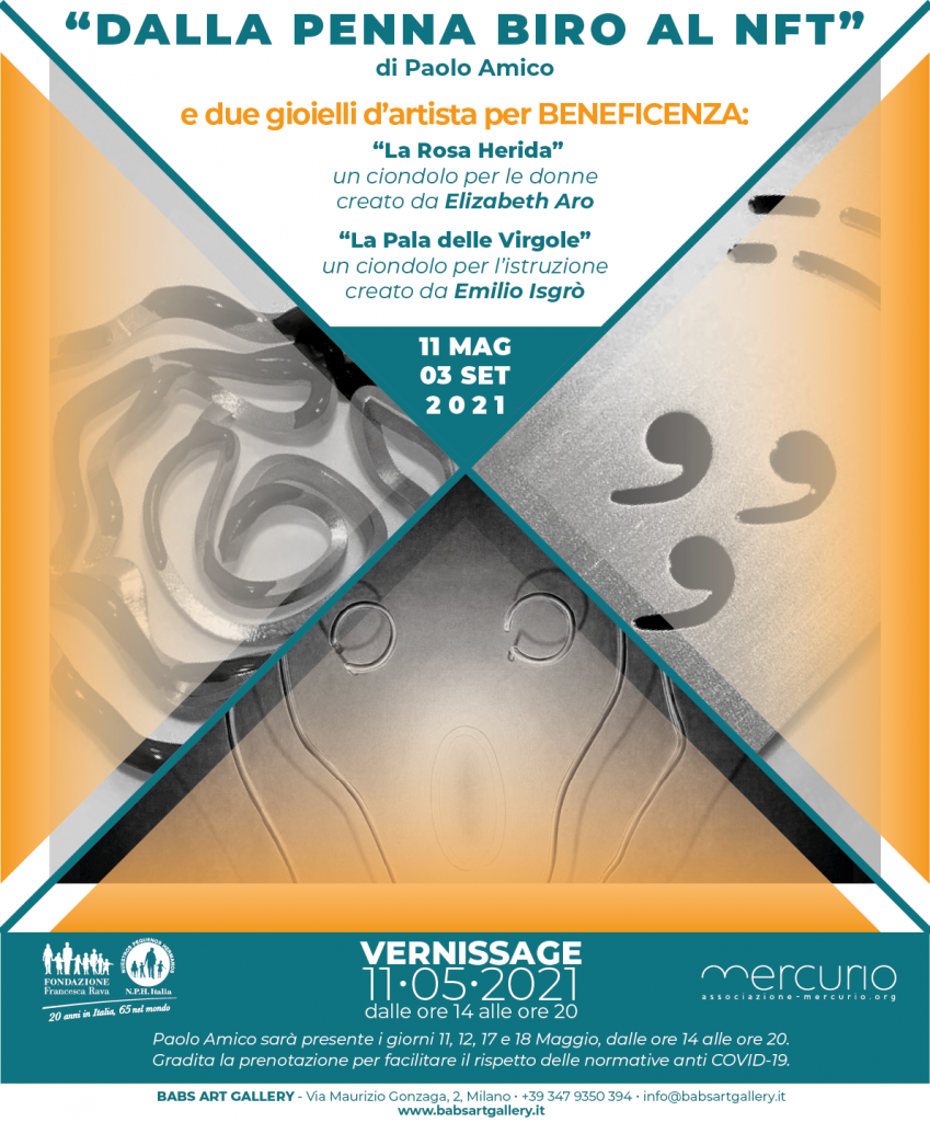 BABS Art Gallery presenta gli ultimi progetti dell’artista Paolo Amico, opere realizzate con il solo ausilio di penne biro colorate, con un focus sulla tecnologia NFT, insieme a due gioielli di due artisti espressamente realizzati per due progetti benefici: il primo a favore della tutela delle donne con la “Fondazione Rava” e realizzato da Elizabeth Aro; il secondo, di Emilio Isgrò, a sostegno del progetto “Pinksie the Whale” di “Fondazione Mercurio” per contrastare l’esclusione, dispersione e abbandono scolastici.