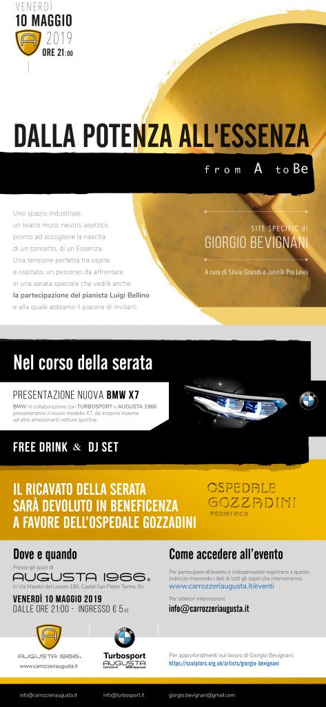 Il 10 maggio 2019 alle ore 21.00, Augusta 1966 promuove presso i suoi spazi a Castel San Pietro Terme (BO) un evento speciale “Dalla potenza all’essenza. From A to Be” che vedrà l’esposizione delle opere site-specific dell’artista Giorgio Bevignani, a cura di Silvia Grandi e Jannik Pra Levis, con interventi musicali del pianista Luigi Bellino.