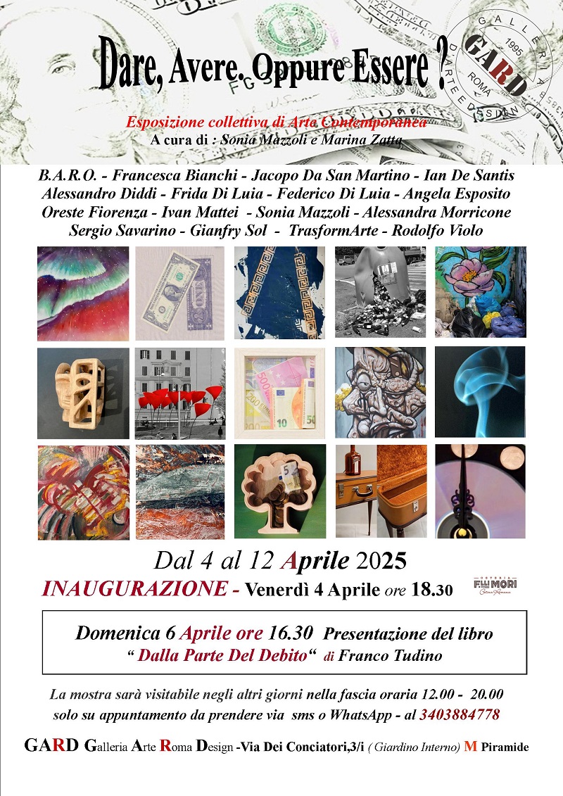 La Galleria Gard presenta la prima edizione della mostra "Dare, Avere. Oppure Essere?" un progetto di Marina Zatta centrato sul libro "Avere o Essere" di Erich Fromm. La mostra si pone come momento di riflessione sul senso e sulla destabilizzazione umana e del pianeta provocata dall'utilizzo del Denaro nella società dei consumi.