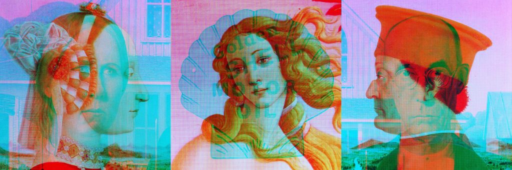 Il lavoro di Luigi Tolotti vede la confluenze di tecniche differenti di immagini prese dal mondo mediale o anche dalla propria storia personale familiare. Le sue opere diventano quindi delle sovrapposizioni di immagini in cui si nascondono associazioni inusuali e sorprendenti, un lupo può celare Joyce, un Cristo di Giotto invece una cantante pop, come in “Cantica XXI” dedicata a Dante. Tolotti mette in scena un eterno presente in cui le immagini-icone sono segni che si sviluppano in modo vertiginoso, conservando però ognuno sempre la propria identità. Ogni immagine ne contiene altre, l’effetto dei led colorati fa apparire o scomparire i singoli frame, in una combinatoria immersiva a cui contribuisce anche un sound dedicato.