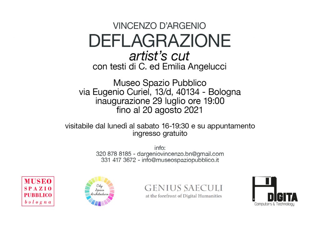 DEFLAGRAZIONE artist’s cut ripropone l’unicum di opere sopravvissute a quell’evento, accompagnate da lavori inediti emersi dal percorso progettuale di D’Argenio e dai testi di C. e di Emilia Angelucci. Il progetto sarà quindi presentato in una nuova forma e adattato agli ambienti di Museo Spazio Pubblico.