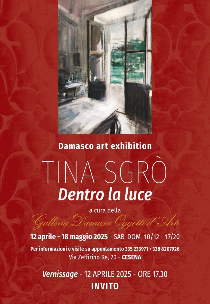 La mostra “Dentro la luce” realizzata a Cesena dalla Galleria Damasco presenta 26 opere dell’artista calabrese Tina Sgrò, che lavora tra Milano e Reggio Calabria ed è da tempo legata alla Galleria d’arte cesenate, con i cui titolari condivide una stretta collaborazione professionale e un sentito rapporto di amicizia.