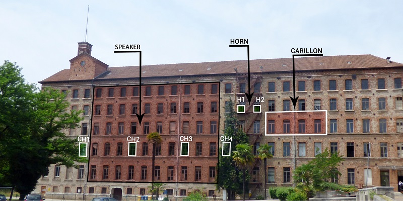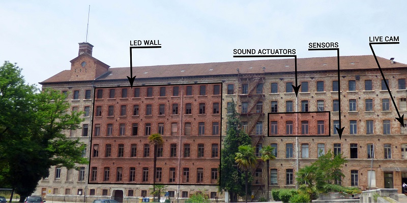 Utilizzando materiali reperiti nelle stanze abbandonate del fabbricato, il collettivo D20 ha costruito infatti una macchina del suono, con martelli che percuotono pezzi di telaio, bracci meccanici che sfregano lamiere, martelletti che picchiettano vecchi trofei ritrovati negli uffici. Inoltre un archivio di suoni, nuovi e di repertorio, catturati e digitalizzati (dei vecchi telai, del lavoro quotidiano nella fabbrica,…) potranno essere usati e manipolati dai compositori come una tavolozza “musicale”. Allo stesso modo, la facciata della fabbrica diventerà un enorme schermo di luci e colori, i cui effetti saranno resi visibili all’artista, durante la sua sperimentazione a distanza, grazie a una webcam puntata sull’edificio.
