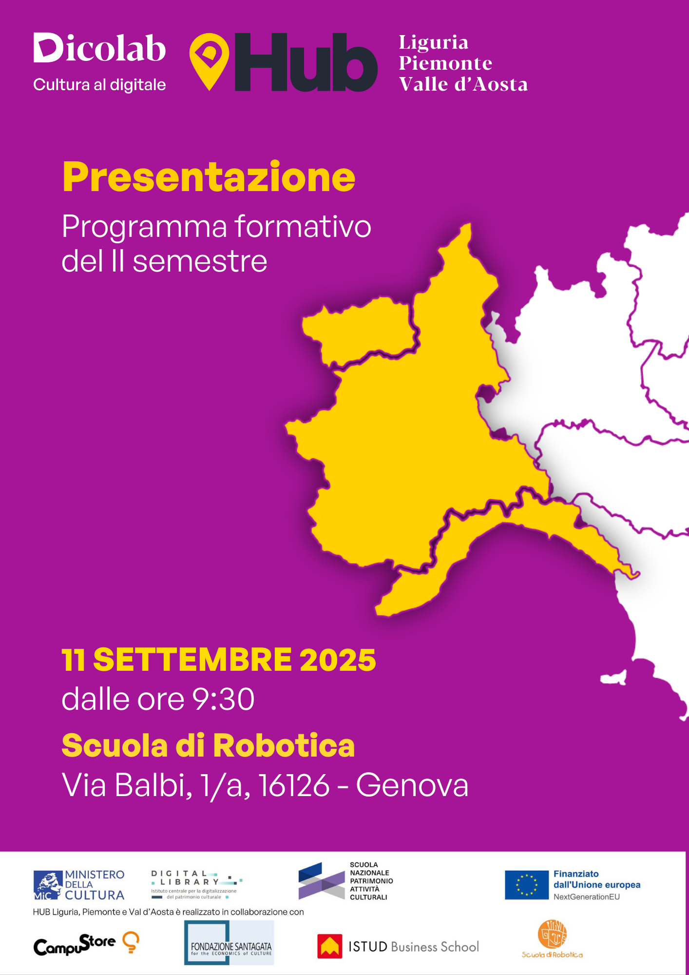 l'11 settembre, dalle 9:30, p.v. si svolgerà a Genova, in via Balbi 1a, presso Scuola di Robotica, il seminario di presentazione dell'HUB Liguria, Piemonte, Valle d’Aosta di Dicolab. Cultura al digitale, il sistema formativo promosso dal Ministero della Cultura - Digital Library nell’ambito del PNRR Cultura 4.0.
