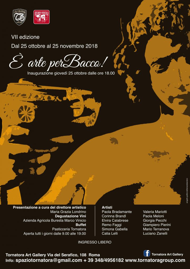 Giovedì 25 ottobre 2018, alle ore 18:00 torna “È arte perBacco!”. Giunta alla sua settima edizione, l’imperdibile mostra/evento si tiene presso la sede della Tornatora Art Gallery di Via del Serafico: un vero e proprio salotto culturale di 200 metri quadri nel cuore dell’Eur. Un punto di incontro, dove celebrare il periodo della vendemmia ammirando opere d’arte ispirate al tema del vino e realizzate appositamente da numerosi artisti. Per immergersi ancora di più nell’atmosfera e coinvolgere, oltre alla vista, anche tutti gli altri sensi sarà offerto un aperitivo firmato Pasticceria Tornatora insieme a una degustazione di vini dell’azienda agricola Buresta Marco Vinicio.