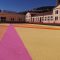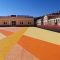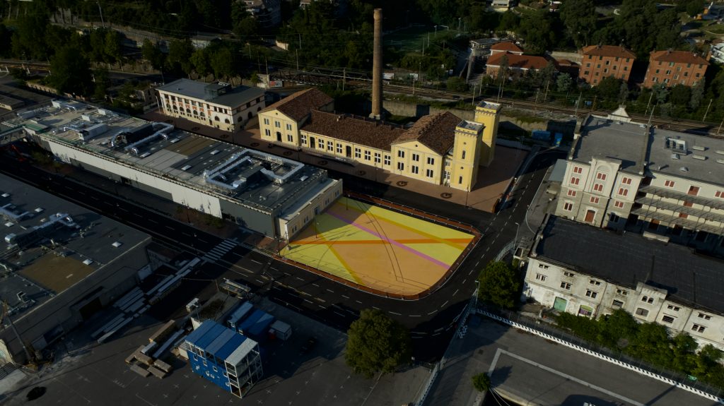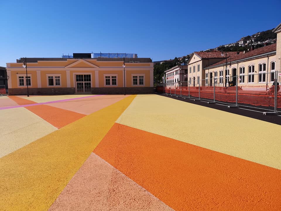 Un’opera dal grandissimo impatto visivo con campate di colori accesi come i giallo, il fucsia, l’arancio intenso in dialogo con i segni già presenti a terra, indelebile traccia di un passato ricco e stratificato.
